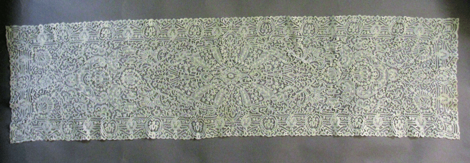 Comments: A runner of Rosaline Perlé – a large piece for this kind of lace. I can’t tell if the perls are bobbin or needle-made. Well worked with an elaborate, dense design. There were probably matching pieces to a set although it is hard to think how the relief could have stood up well to tableware.