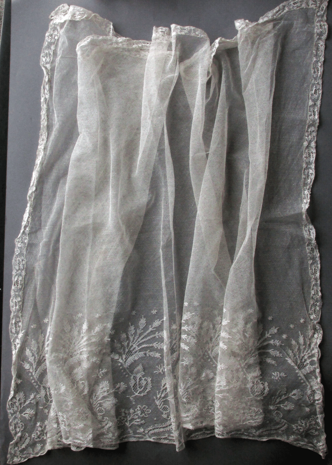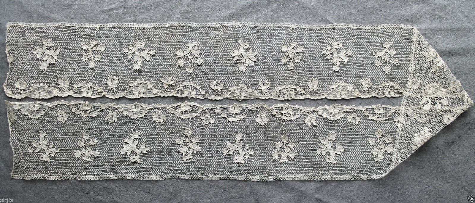 Comments: A rectangular veil of Lille. The straight lower border and rather thin lines of the motifs are early 19th century features. The lace is made in strips, and you can clearly see the racroc joining the lower edge, which seller says is ~8″ wide. The rest is point ground net and a narrow border is sewn around the sides and top. I’m thinking the lower part is cut from a longer border; the design is interrupted on one end, probably on the other, but closeup photos are lacking. This is not uncommon in pieces like this, and sometimes the large areas of net are actually machine tulle. I wouldn’t be surprised if the thread is linen.