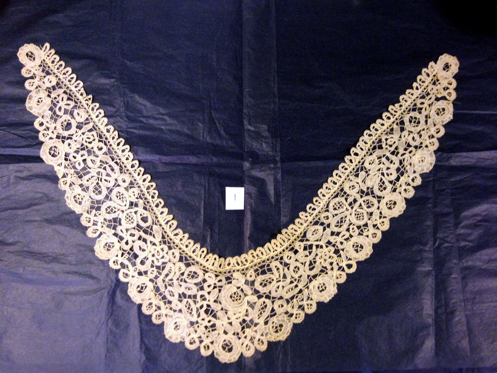 Comments: A bertha of Burano needlelace. Documented examples range from late 19th well into the first part of the 20th century, so it’s a little hard to date. The design is a meandering floral, with motifs a little smaller than usual, and there’s not much in the way of fillings or elaborate clothwork decoration.The typical couched outline thread is clearly visible – overall it’s a nice example. These don’t come up too often, maybe 3-4 per year on Ebay.