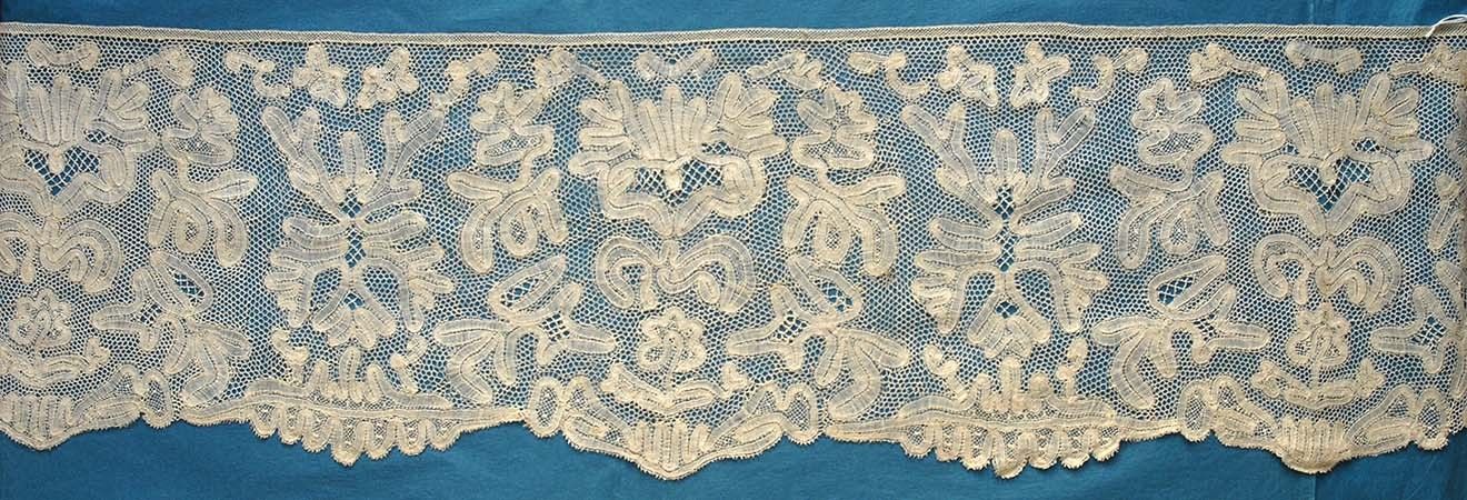Comments: A tape lace flounce which has the typical later 17th c 6 pointed star mesh found in both Italian and Flemish work. The mesh is worked around the motifs, again an early characteristic. But I’m going to guess that it’s a 19th c Italian piece. The design elements are a bit lopsided in many places, and earlier pieces normally don’t overlap the tape in the trail. And I don’t see the careful top and bottom finish that one would expect in an early piece. These laces are not well documented, and were made up into the 20th century.