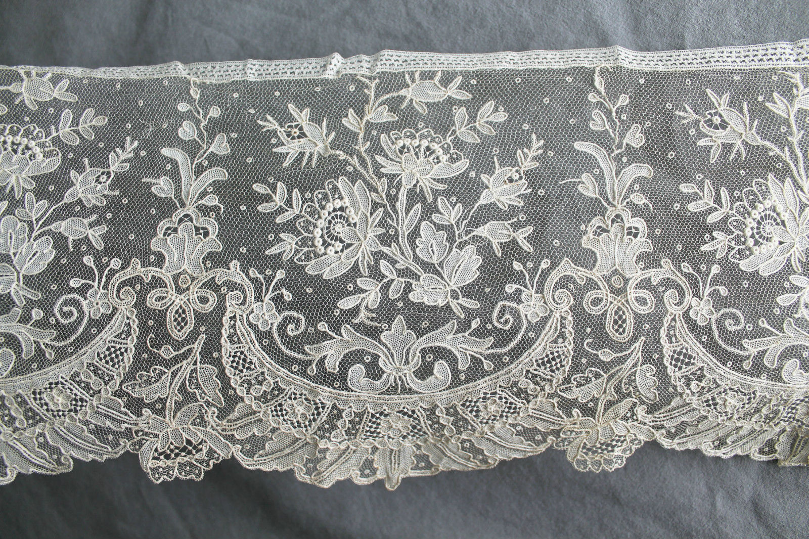 Comments: A flounce of Brussels bobbinlace application on machine net. flowing design with moderately large areas of needle-made fillings – middle market product. No esprits in the upper ground.