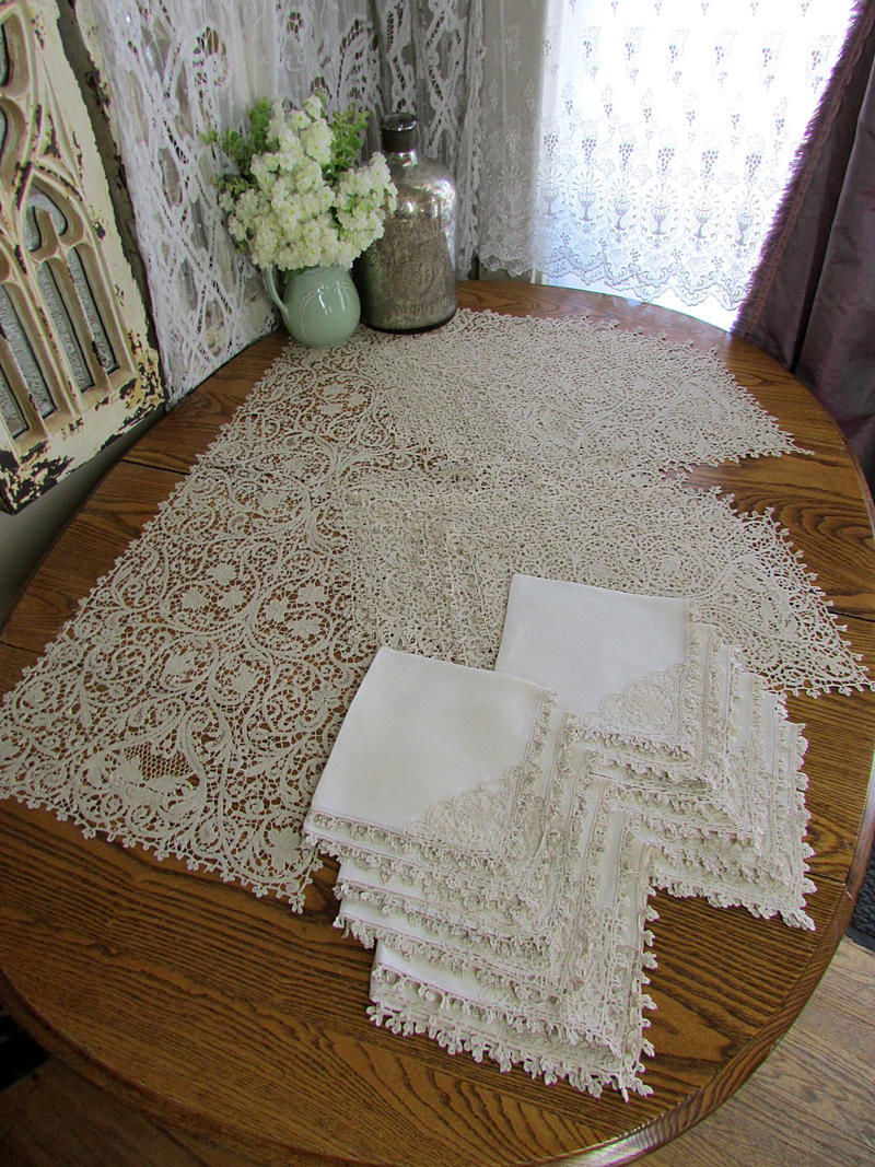 Comments: A complete set of a runner, 12 napkins, 12 placemats of Italian Cantú bobbinlace. Table linen collectors place a premium on the completeness of a set. This does not have the typical Cantú motifs, however the figural work and the general tape technique makes this a reasonable assumption. My other option would be Belgian work. Interesting almost renaissance design.
