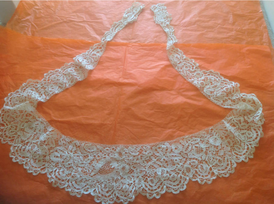 Comments: A large shawl collar of pieced lace, which has a bit of a Bruges look to it. But the ground is a roughly hexagonal grid of picoted buttonholed brides. Looks like some of the fillings might also be needle-made. Quite a bold design, and I don’t really know where this was made.