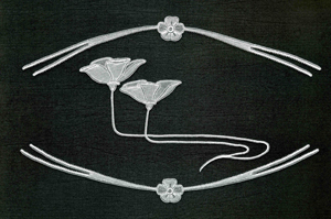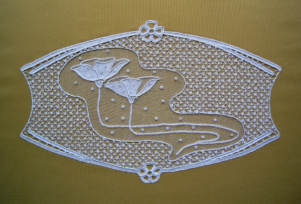 You don’t have to be a big museum or an internationally known organization to mount a wonderful show. “California Poppies” is a traveling exhibition of the work of forty-five pieces by thirty of today’s finest lacemakers from 12 countries, each interpreting the same pattern. The idea began with a conversation between Ulrike Voelcker and Susie Johnson at the 2008 IOLI Convention in Rockford, Illinois.  A group of teachers at the convention further developed the concept, and decided to ask lacemakers to interpret the same design in different lace techniques.  Yvonne Scheele-Kerkhof suggested the Californian poppy since the IOLI convention the following year was to take place in Los Angeles, California. Ulrike Voelcker drew the Art Nouveau final design.