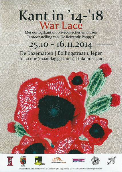 This exhibition commemorates the 100th anniversary of WWI. The Kazematten is a series of underground halls built around 1685. They had many uses over the years, and served as bomb shelters in WWI. One hall shows historical laces and other materials lent by the city of Ypres. Another hall shows contemporary lace on the theme of war – often incorporating the poppy motif. Very much in keeping with this theme, the exhibition also includes the final showing of the International Poppy Project.