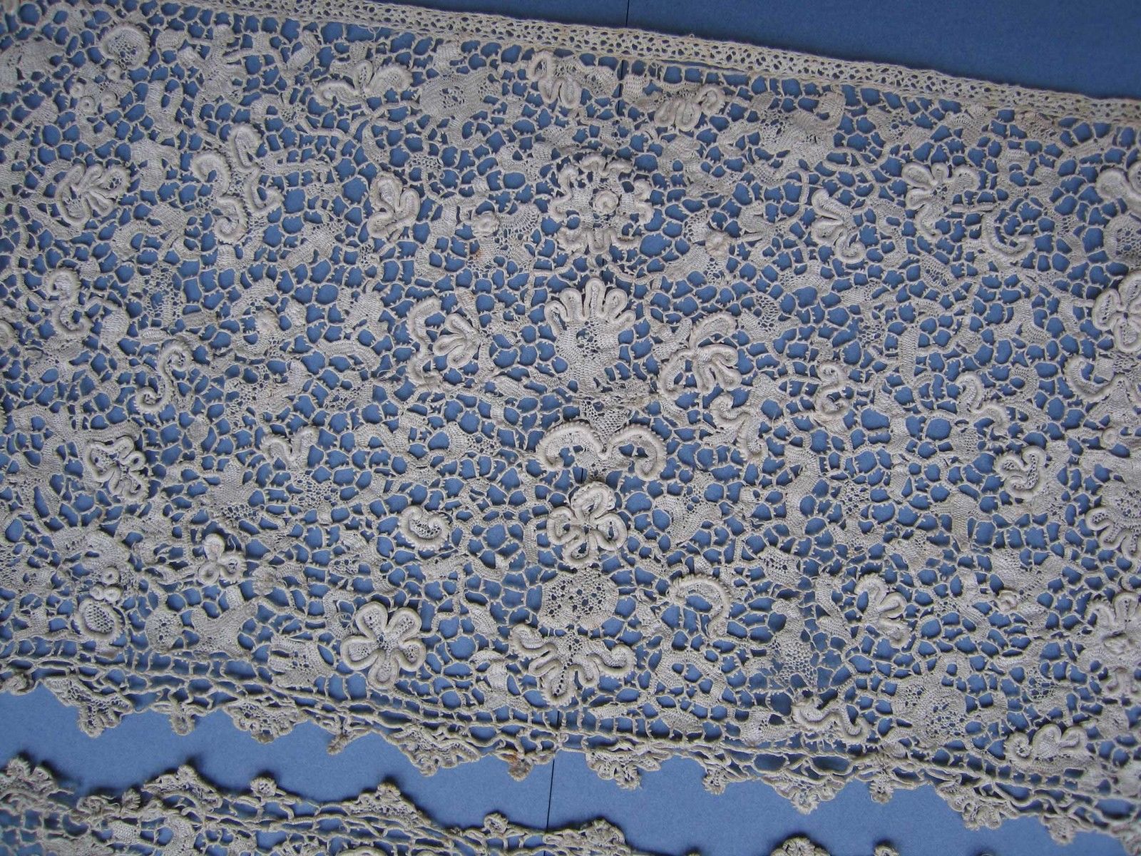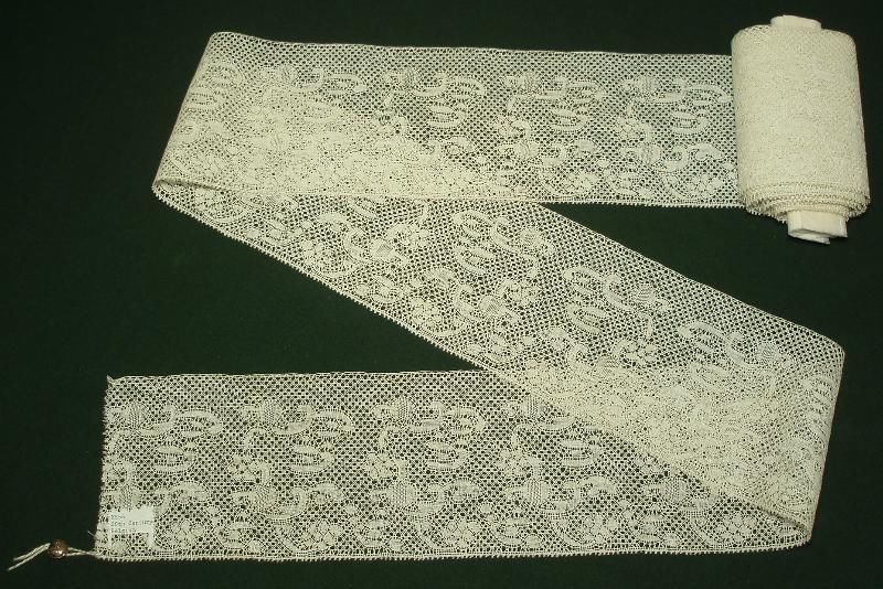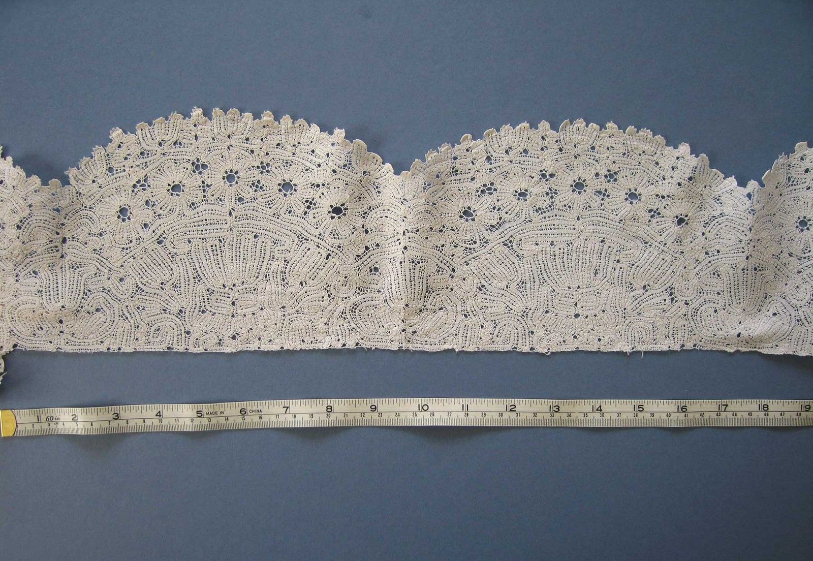 Comments: A Duchesse de Bruges flounce. Well designed and executed motifs, with heavy gimp edges. Good dense, romantic design, quite effective.