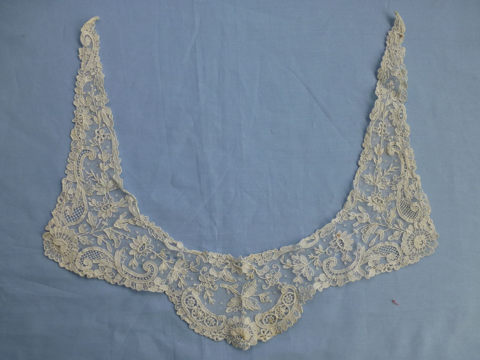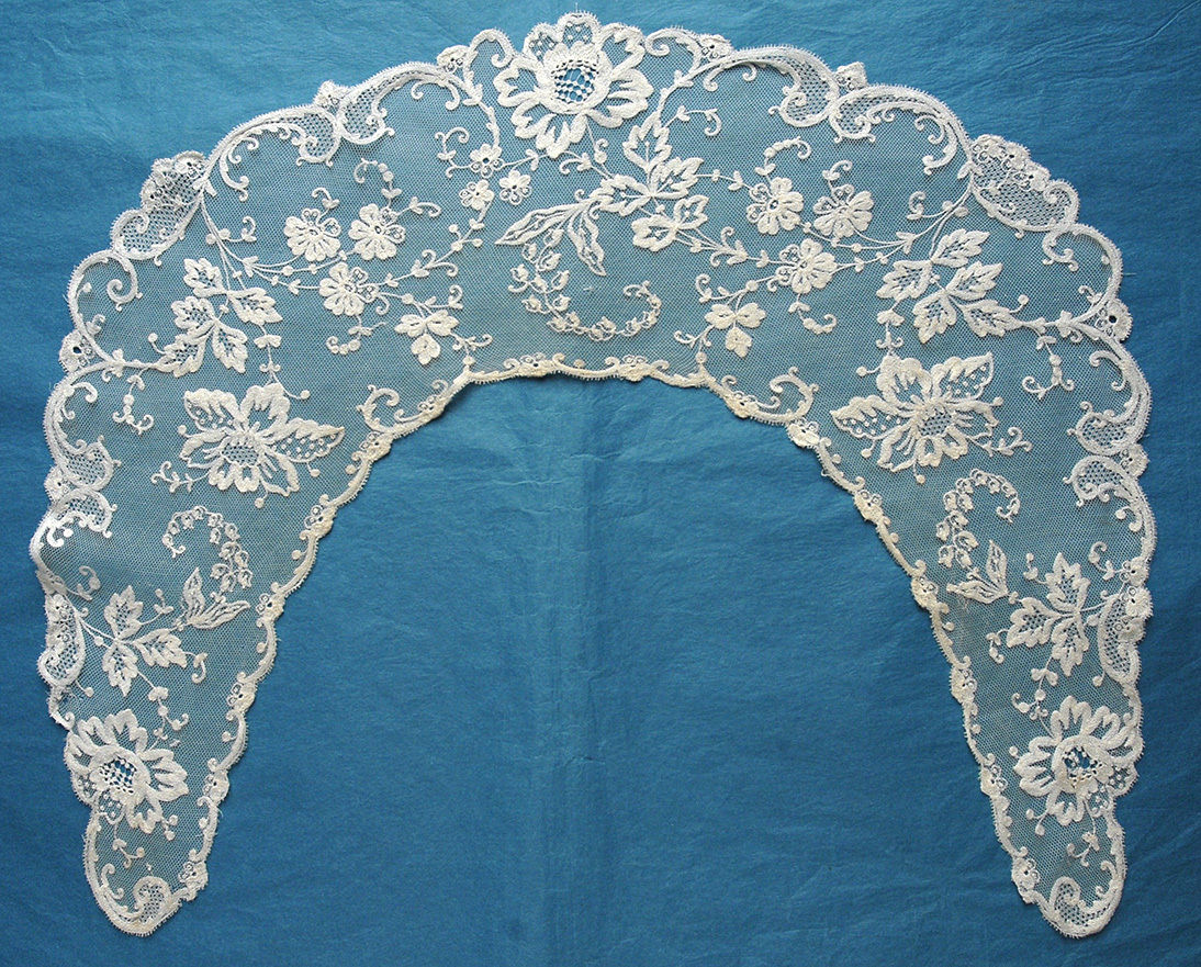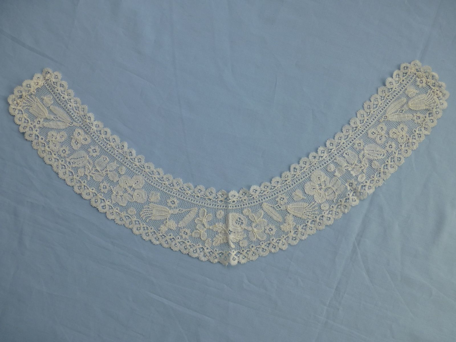 Comments: A collar of tambour embroidered machine net with needlerun fillings. A few needle-made free fillings also. The tambour could indicate a Belgian origin. Quite an elegant, partially asymmetric design with good contrast between the tightly worked solid and more delicate filled parts.
