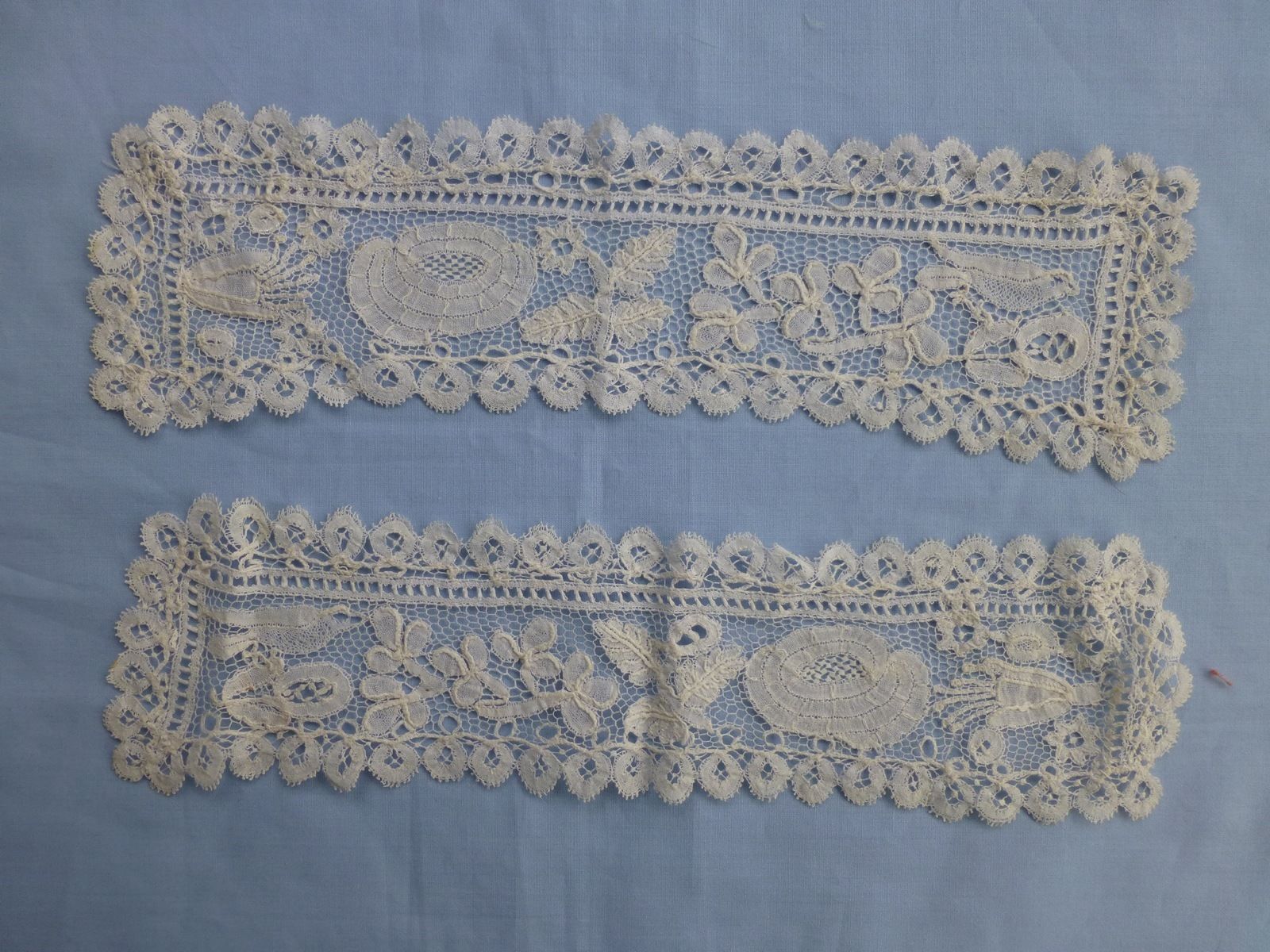 Comments: I’ll put these two together since they are rather similar. Both are Honiton motifs needle-made ground (Honiton Point). Nicely organized design with some flowers that I haven’t seen before, and note the birds in the cuffs.. Not sure how the fillings are done, they might be needle-made single knots or maybe a single woven tally. Photos not close enough to tell. The loped band wraps around the pieces, a bit clumsy in finishing at the ends of the collar.