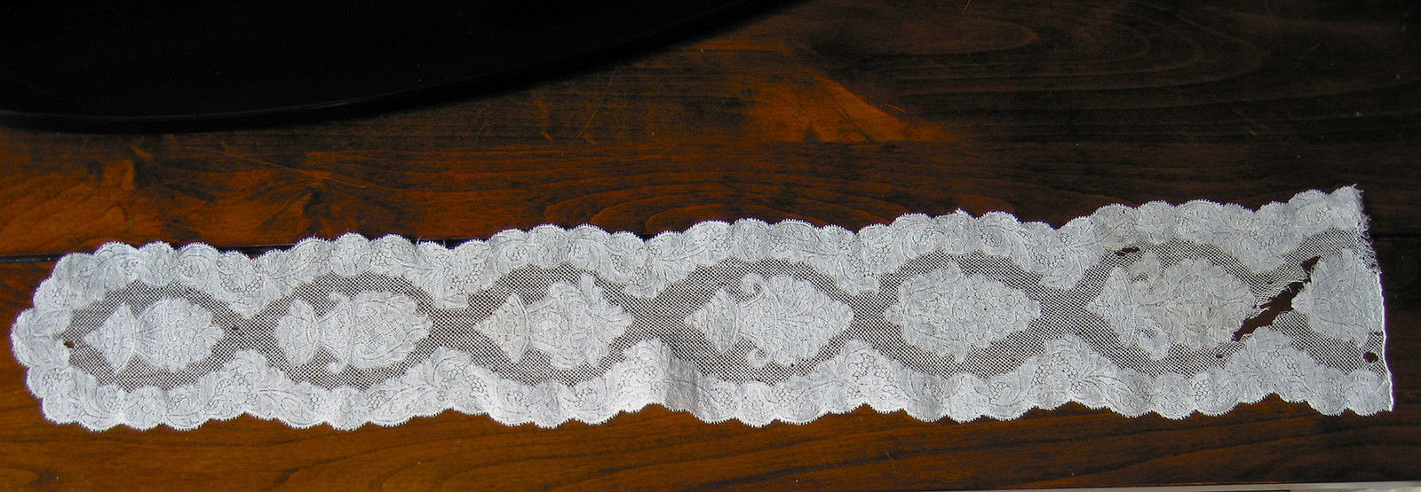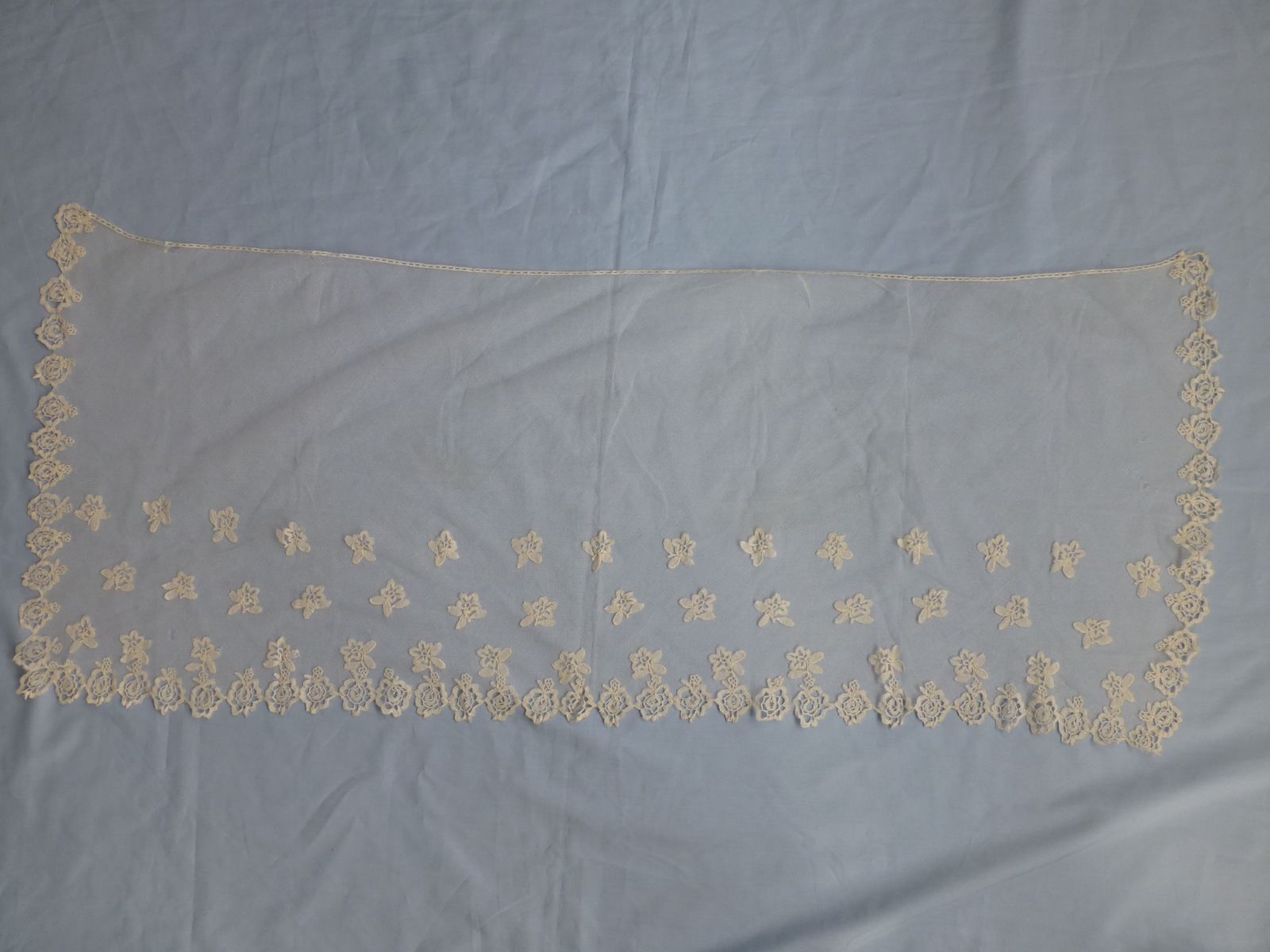 Comments: A bonnet veil of Honiton applique on machine net. No woven tally leadworks; that’s unusual. Only two types of motifs, a flower with leaves used which fill the lower part of the veil, and some turkey-tail-like motifs around three edges. Narrow edge along the top meant to thread a ribbon through. I once did that with a very narrow silk ribbon on a bonnet veil much like this – took me an hour, and that was skipping every other hole.