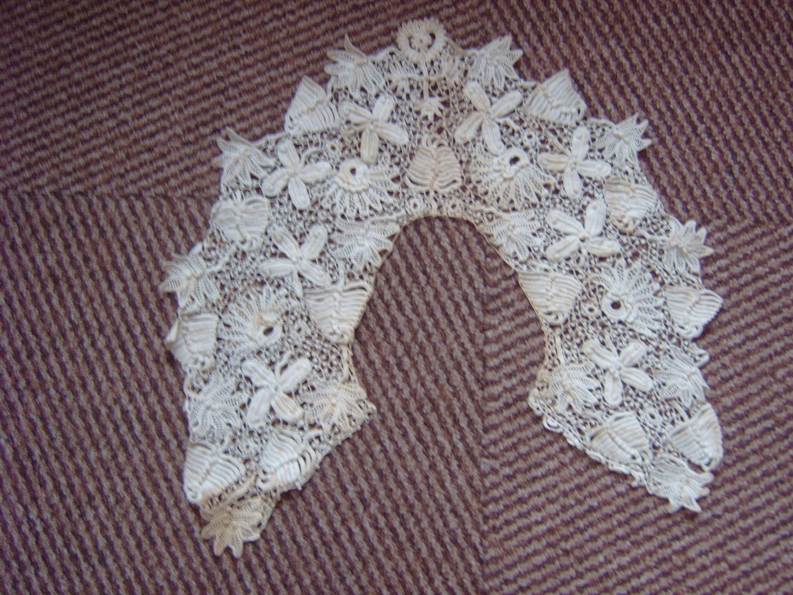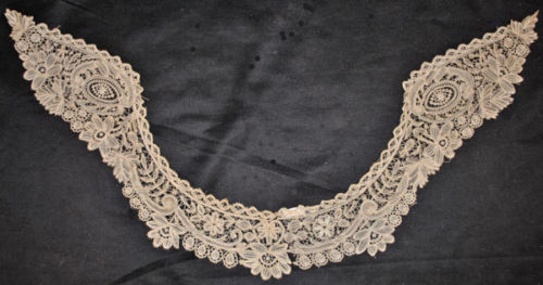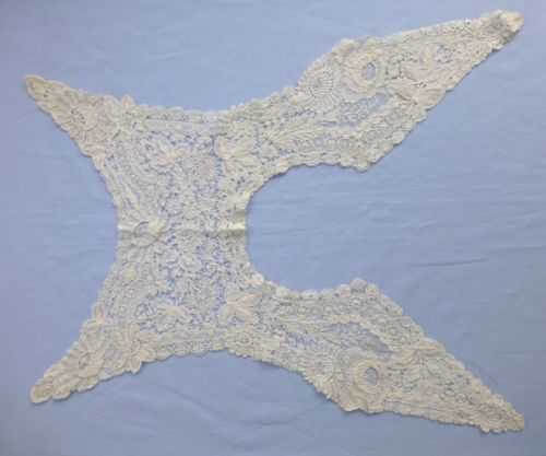 Comments: A deep Honiton guipure collar. The form is a bit unusual, but looks properly displayed in the listing. The style is a little snails/slugs, but starting to break out of that mode with well executed roses and pinnate leaves. The design is a bit haphazard – typical English flower garden, or more properly, like the hedge row flowers found in the Devon area. Woven, picoted irregular brides, and good woven tally leaves in the leadworks.
