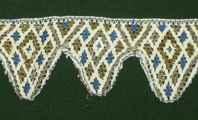 Comments: I’ve had lots of wonderful conversations with this seller, who is an expert in Eastern European costume. This metallic/colored lace is from the Krakovany/Pobedim/Podolie region of Slovakia, used as a collar for a traditional blouse. Wonderfully bold presence for a rarely seen lace.
