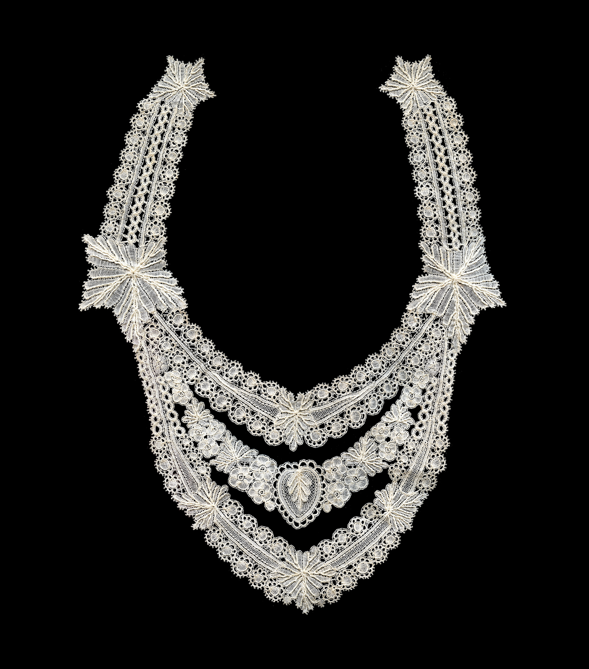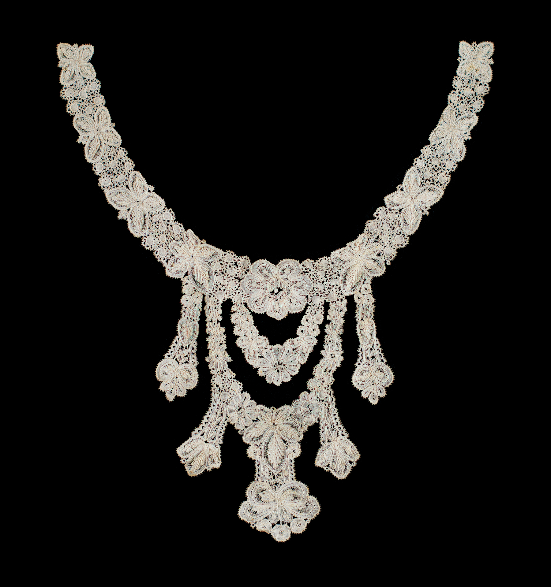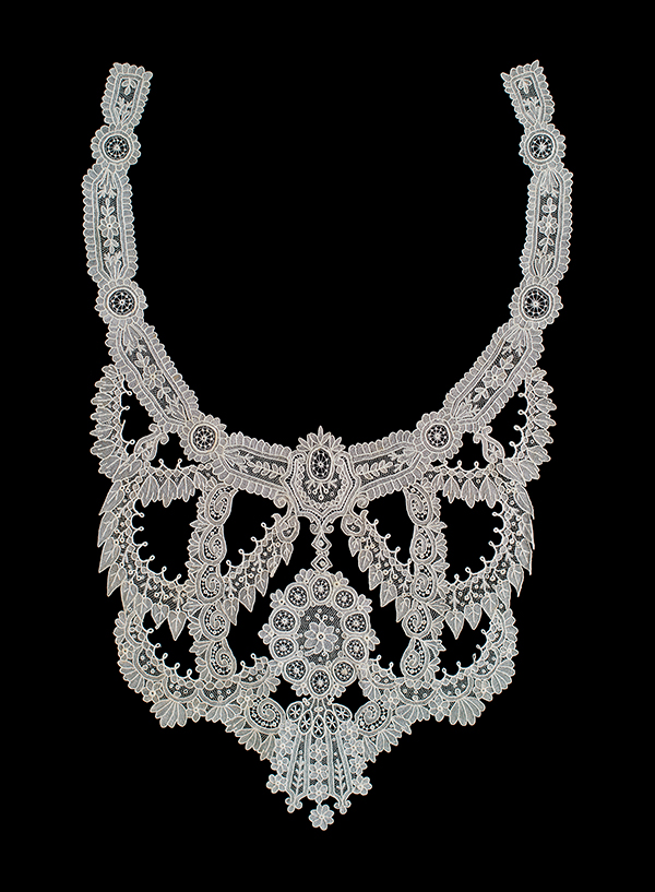 Comments: A Point de Gaze collar, with raised petals in the roses. A few decorative ‘mode’ fillings, and note the grids of knots in some elements. The design is a bit conventional, but works quite well for this specific form.