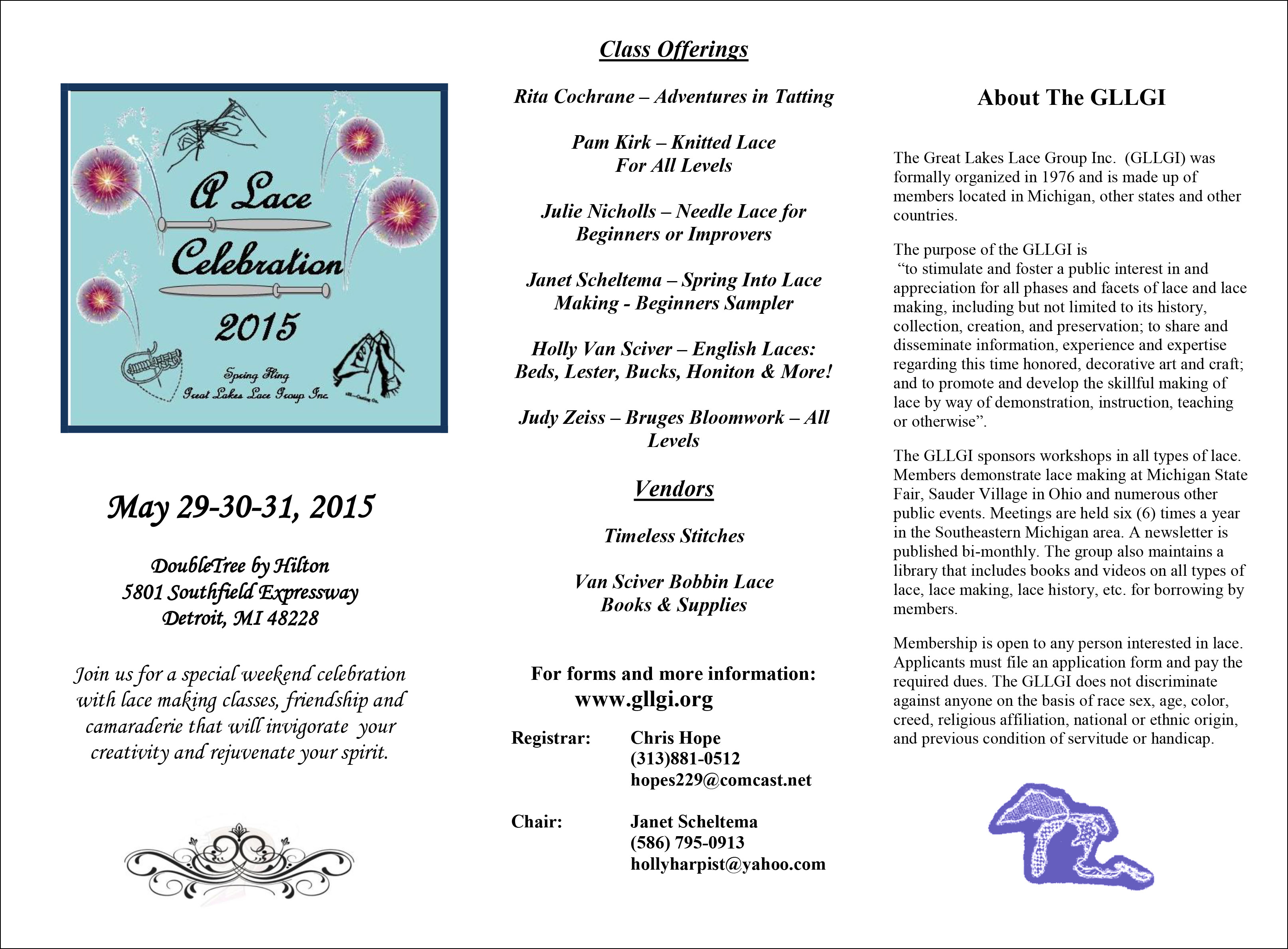 Fees: Check, traveler’s check or money order to GREAT LAKES LACE GROUP INC