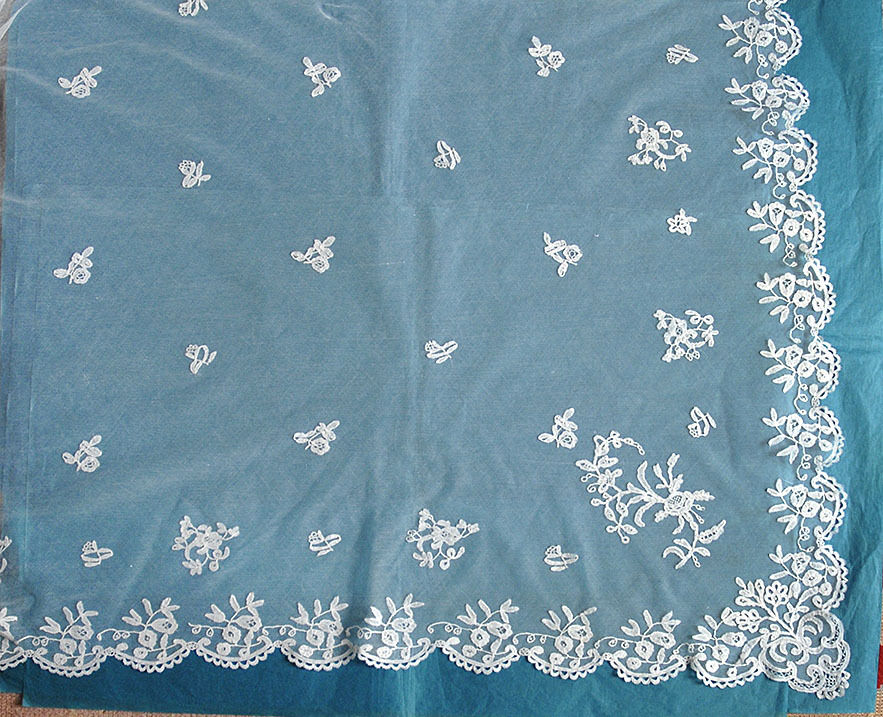 Comments: A rectangular veil of Honiton applique on machine net. Floral scalloped border all around with larger flower sprays in the corners just inside the outer border. and Smaller sprigs used as esprits in the main ground. Snails/slugs style with woven tally leadworks used as fillings. Soft, supple tulle.