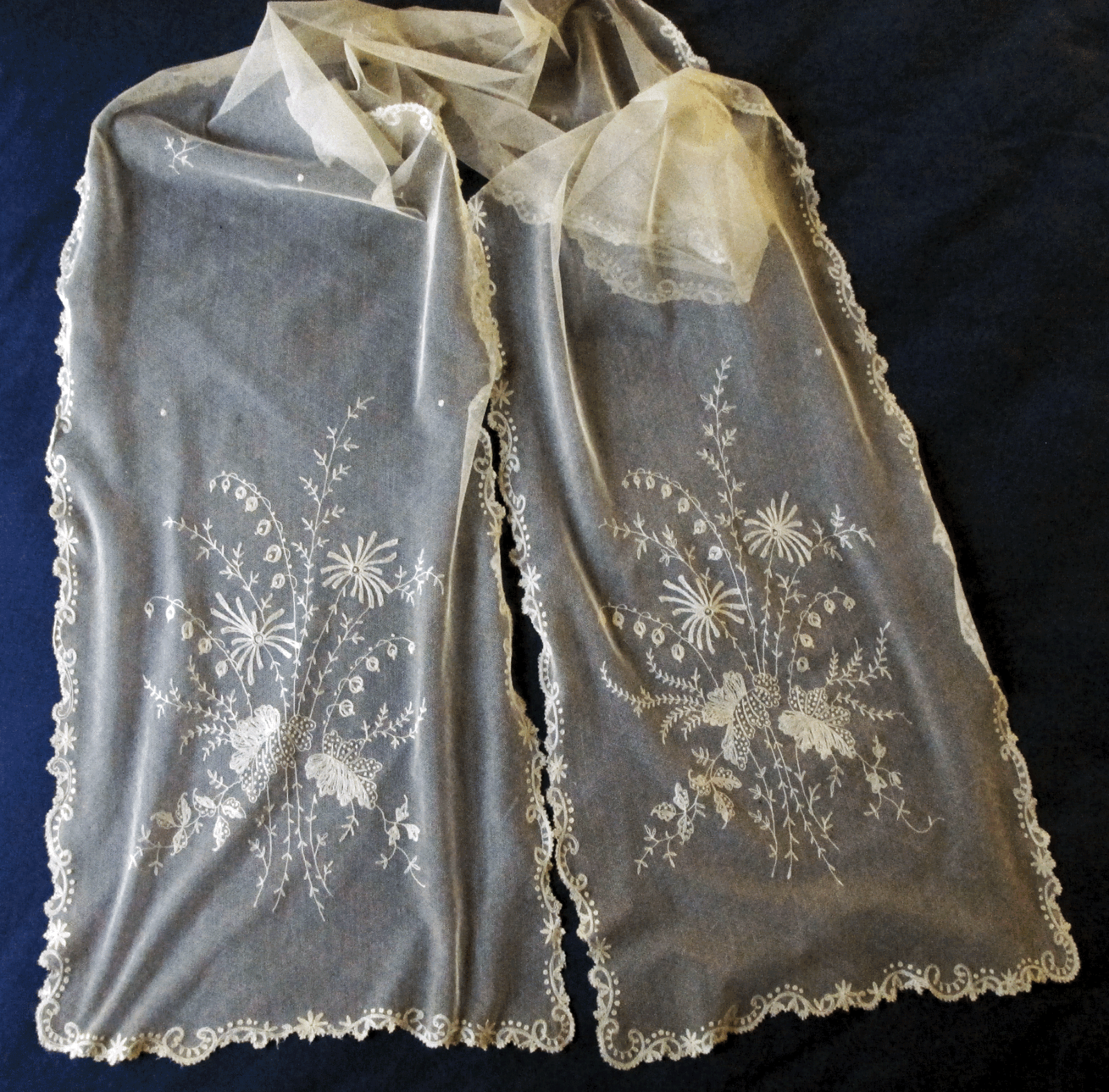 Comments: A tambour embroidered machine net narrow scarf. Quite an effective floral spray at the ends, with a narrow scrolling border around all edges. Some small sprigs and dots used along the length of the piece.