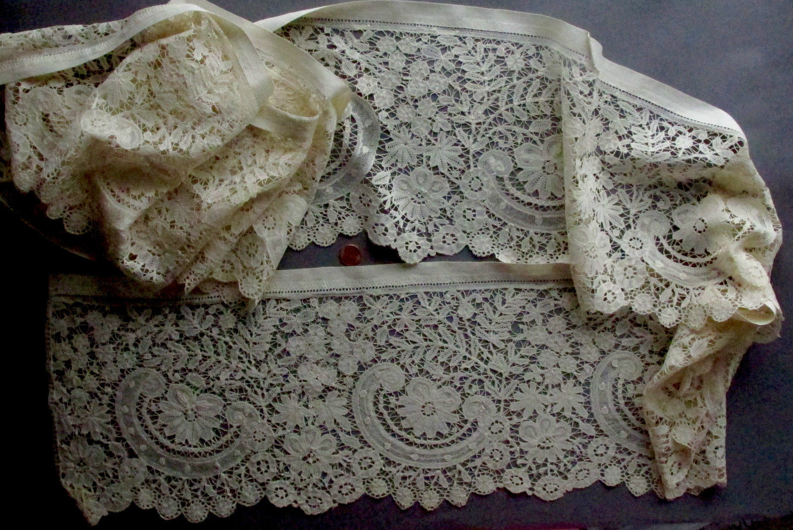 Comments: A long, wide flounce of Chantilly. The design is rather simple, a straight ribbon along the lower border with periodic swags and a rose and leaves in the upper ground. Scalloped border, sold points used as esprits. Honeycomb stitch fillings, no ombré shading. Hard to say if it’s French or Belgian – France tended to use a finer thread. I can’t tell form the photos. It looks like it is composed of 3 or 4 strips joined by racroc stitches.