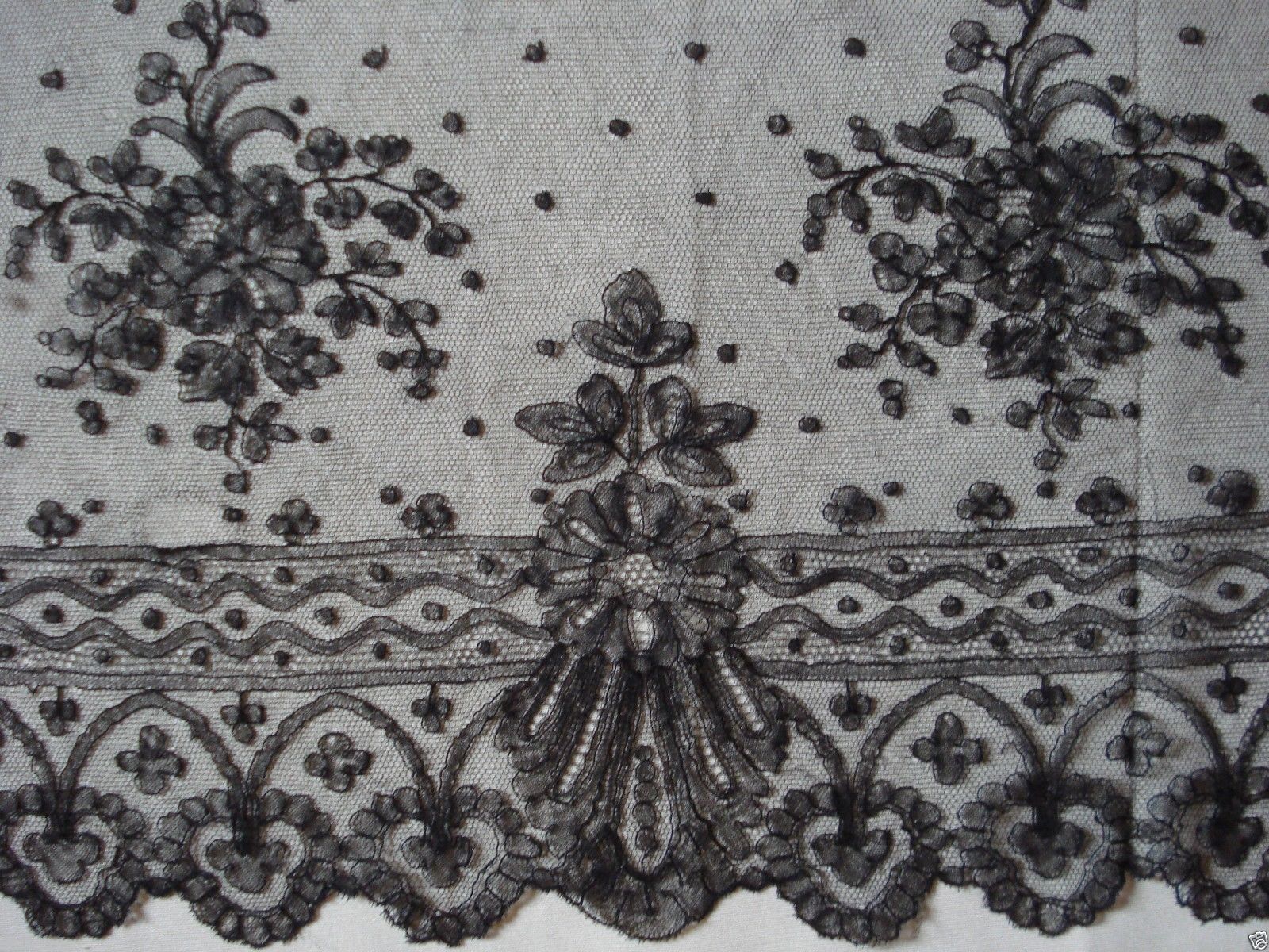Comments: A long border of black silk Le Puy guipure. Picoted 6-pointed star ground, which is one of the most common grounds for this type of lace. Note the little diamonds against a point ground, another characteristic. Some good guipure work in the ground, and also note the rather thin woven tallies along the lower edge. A typical example.