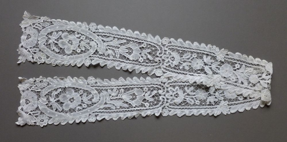 Comments: A pair of ‘lappets’ of Valenciennes, round hole, approximately 3rd quarter 18th c design. These were assembled from a narrow border sewn together along the long edge. Parts were cut off and attached to the ends to form a nice termination. I can’t see the center section entirely so hard to say how that was made – but the pattern matching is off. It does use the same pattern of lace. I think this might have been done in the 19th c because the entire piece is surrounded by a separate picoted edge. This was often done in the 19th c to ‘liven up’ an old lace.