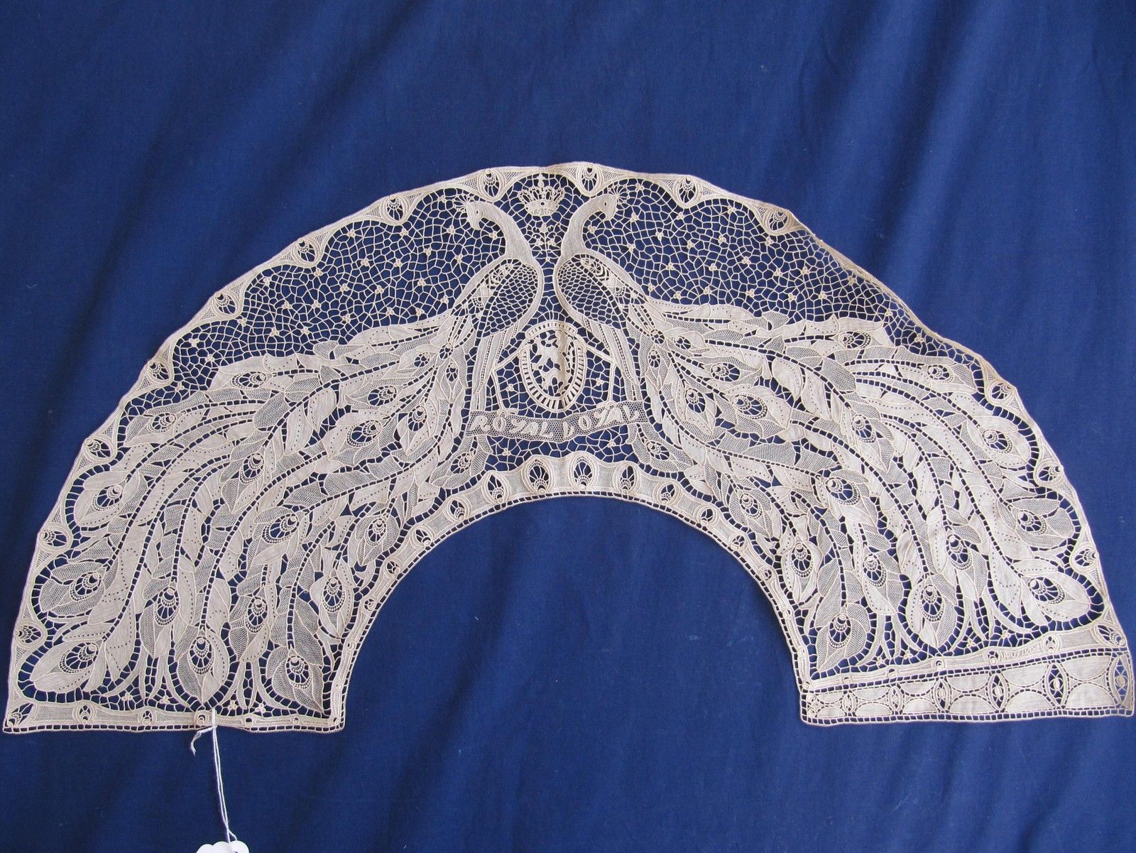 Comments: A needlelace fan with an Art Nouveau design of two peacocks. The date 1916 is worked into the crown at the top, and the Belgian Coat of Arms is in the center of the piece, and it falls squarely in the War Lace category. This very likely is the piece illustrated in the December 1917 exhibition catalog that the seller cites – I’ve compared the two in details and there are just too many similarities in the needlelace, which is difficult to replicate.