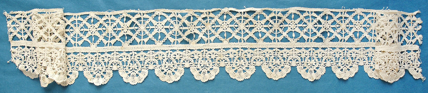 Comments: An insertion and scalloped edge border of Genoese bobbinlace. It looks like an early 17th c piece, especially with the compact woven leaves. The top insertion is based on reticella design, while the bottom is another typical Genoese motif with a ‘fan-like’ border. You do have to be extremely careful on age attributions with a piece like this, but the photos look good. Especially the double plaited line running vertically which divides the motifs – you see similar things in contemporary Punto in Aria needlelace.