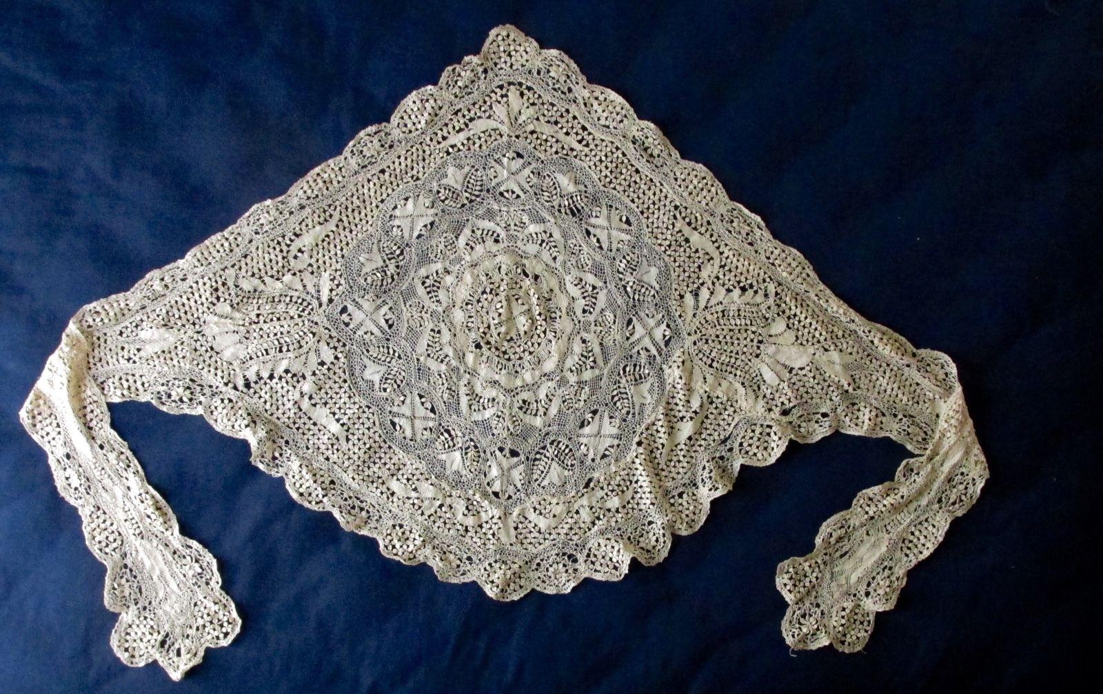 Comments: A Maltese mantilla, typical diamond shape with lappet ends. The center roundel looks a little lighter color than the rest of the piece. Good guipure work outside of the center and down the lappets. The outside edge alternates between a flower motif and a mat of woven leaves. I like the use of the wheat ear motifs in the center part.