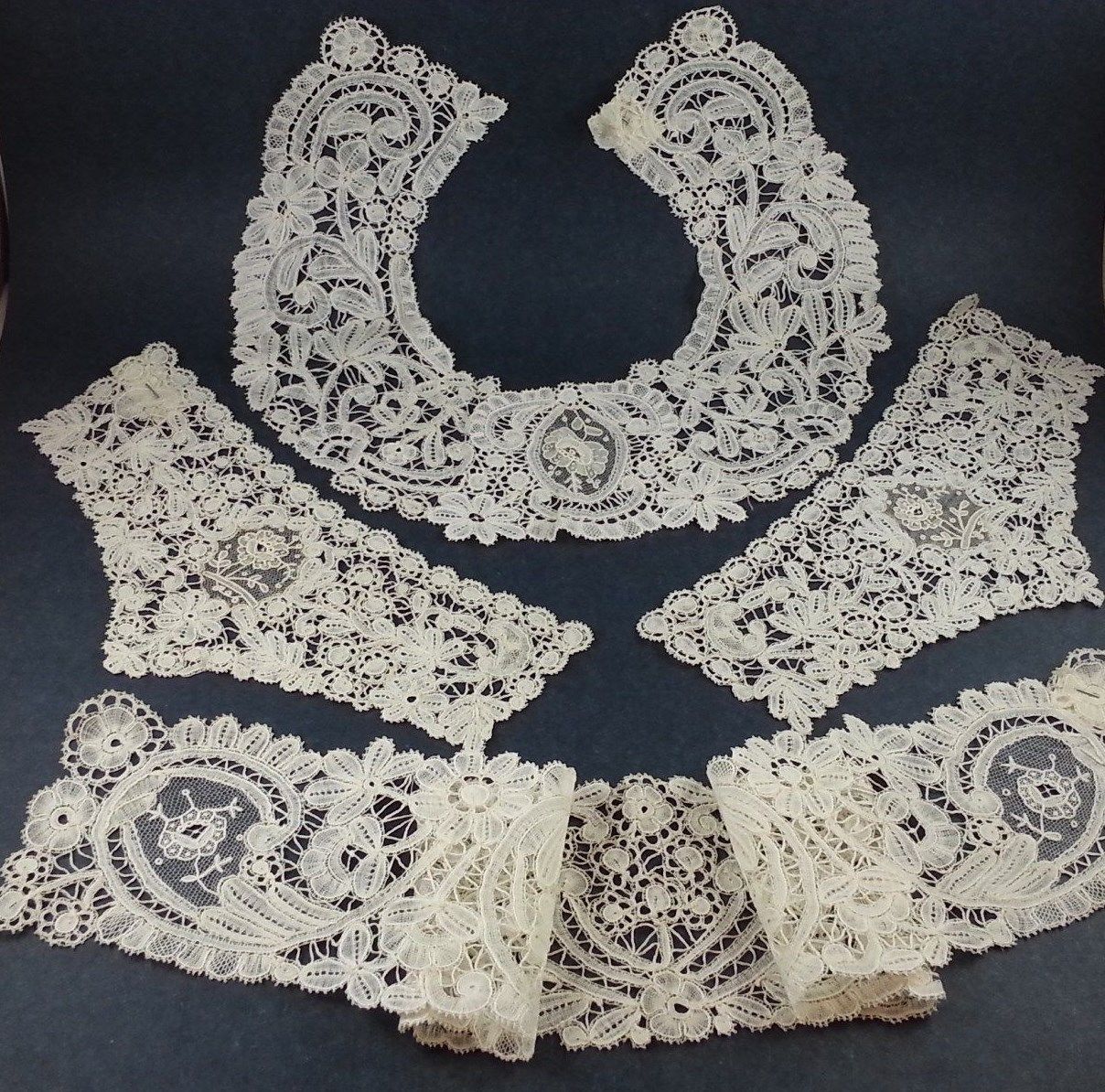 Comments: A set of two cuffs, a collar, and what looks like a neckpiece of Duchesse de Bruges. No raised work in the Point de Gaze inserts. Conventional Duchesse motifs and design, no raised work. They look like they all match.