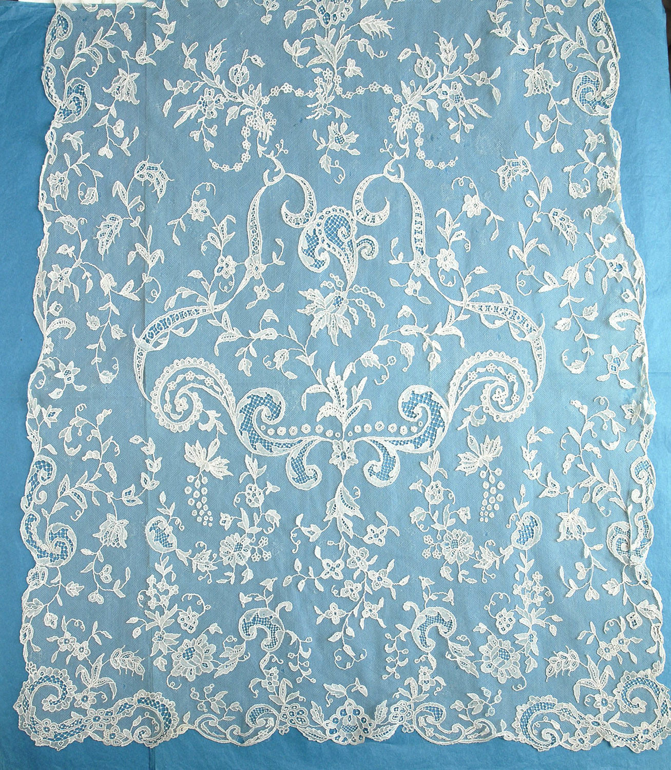 Comments: A rectangular shawl of Brussels needlelace applique on machine net. Some fillings of rings and knots in a grid pattern, no elaborate ‘mode’ decorations. Floral design with lots of trailing tendrils, no esprits. I find the design a little stiff- almost looks like contemporary examples of muslin applique on net.