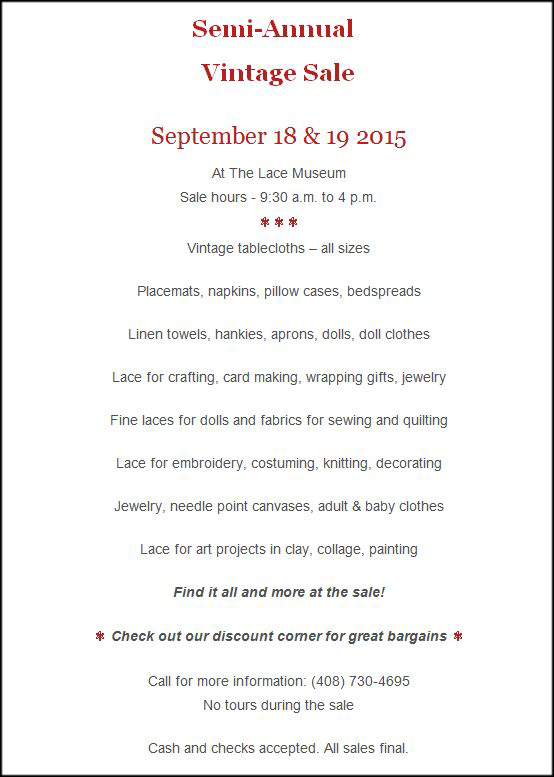 Twice a year The Lace Museum holds a fundraising sale, including some fine laces. No tours during the sale, and the museum will be closed October 3rd. All sales are cash or check only.