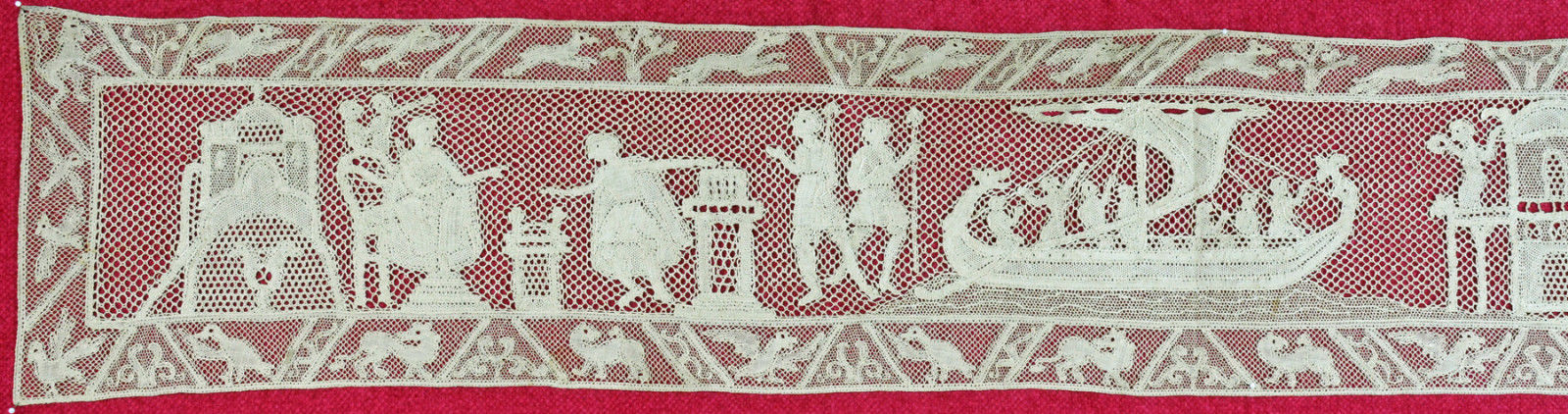 http://tinyurl.com/ncwawaz VINTAGE HAND MADE FRENCH NEEDLE LACE BAYEAUX TAPESTRY, 53 1/4″ LONG