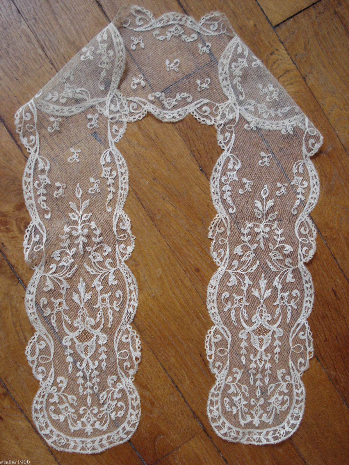 Comments: A lappet scarf of Brussels bobbinlace applique on machine net. Some needle-made knots singly and in grids are used as fillings, along with some rings buttonholed in the tulle. Simple design, mostly at the ends. A good middle market product.