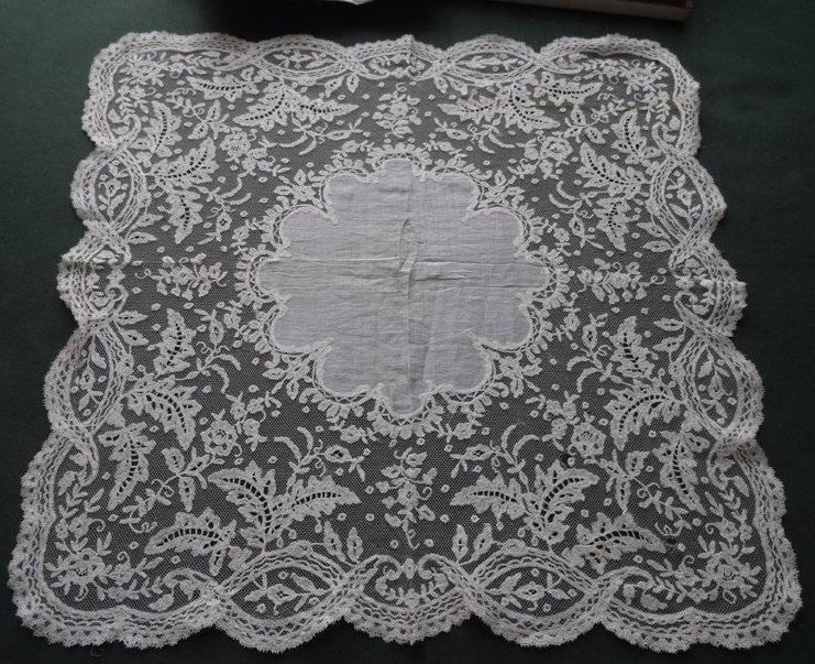 Comments: A handkerchief of Brussels bobbinlace applique on machine net. Romantic floral design, well organized with finely worked technique. Minor needlelace accents, just a few knots used as fillings. Quite unusual for something like this to have the box survive. You see surviving boxes much more often from French manufacturers like Lefébure.
