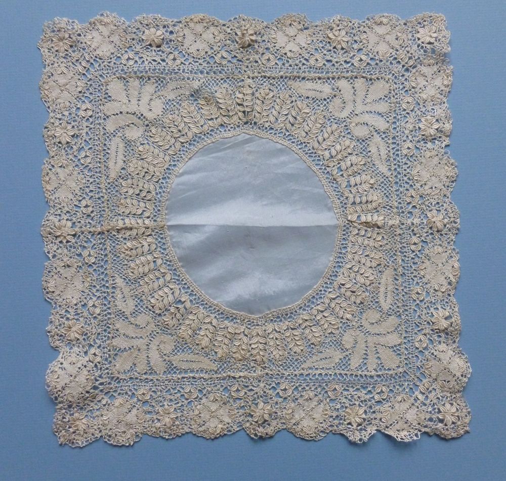 Comments: A Maltese handkerchief of cream silk with a round white silk center. Three part construction: The outer border alternates Maltese crosses and flowers. The inner border has radial wheat ears. In between is an elegant guipure pattern in the corners with a square mesh ground.