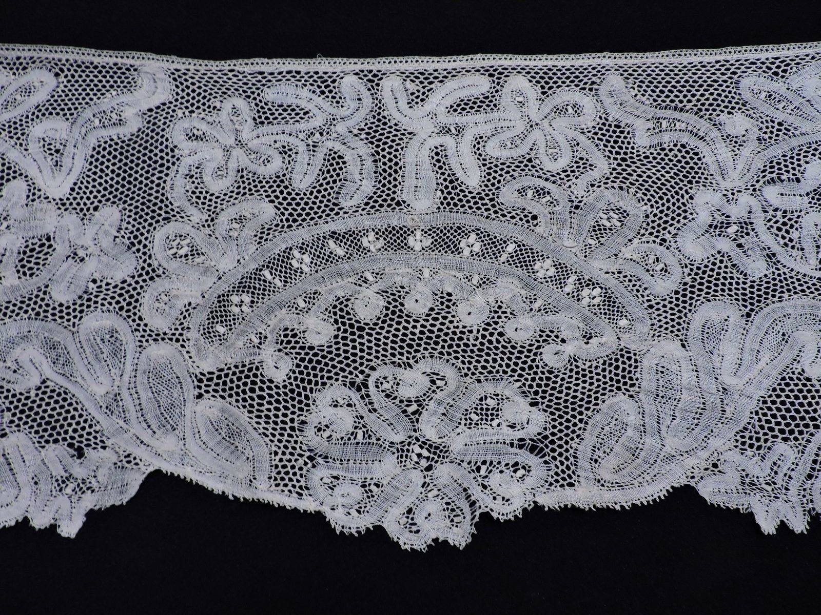 Comments: A scarf of Brussels Duchesse. No raised work in the Point de Gaze inserts, but there is some on halfstitch background in the bobbinlace. Note the interesting needlelace decorate ‘mode’ flowers in the centers of many of the bobbinlace flowers. Overall an elegant, complex design.