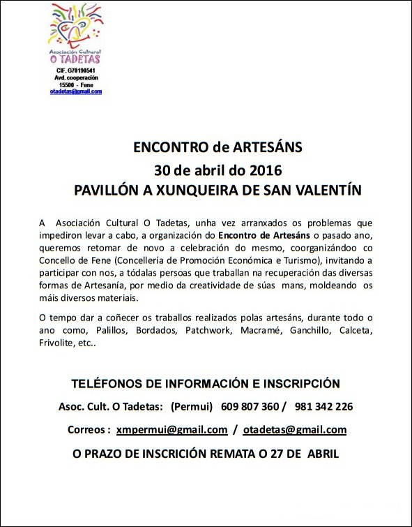 This event draws artisans from the Ferrolterra region of A Coruña in Galicia. Participation is broad, including lacework, patchwork, spinning and weaving, and many other arts. About 700 artisans are expected, and about 100 vendors.