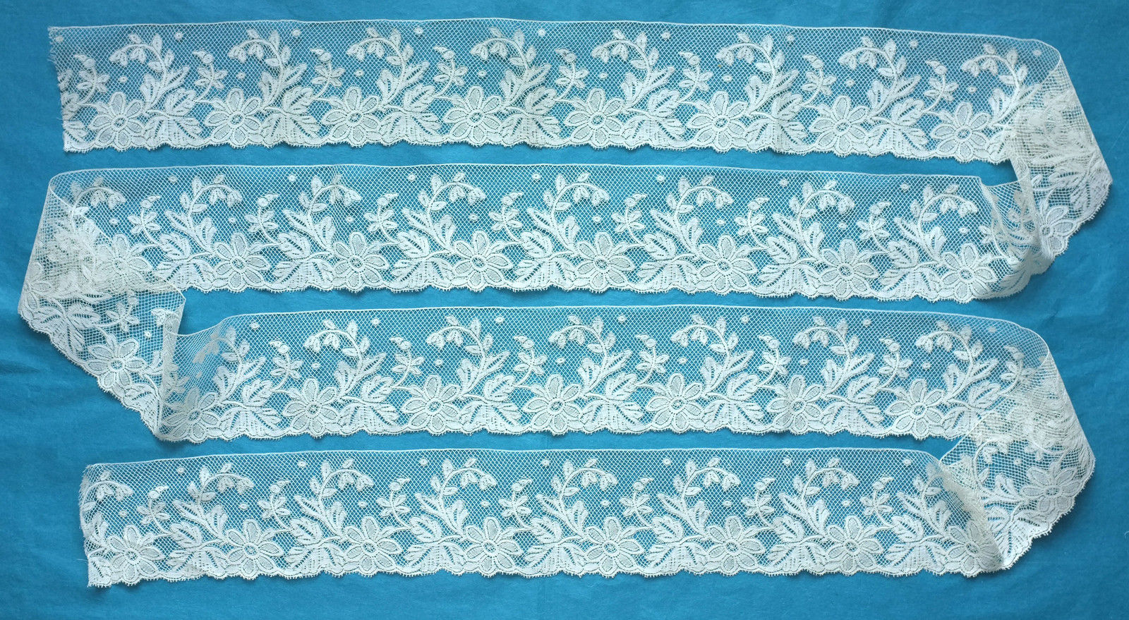 Comments: A square mesh Valenciennes border with ombré half-stitch shading. Short repeat, very careful technique with just a few esprits in the ground. I like the term ‘petticoat border’, this lace was often used to edge personal linens.