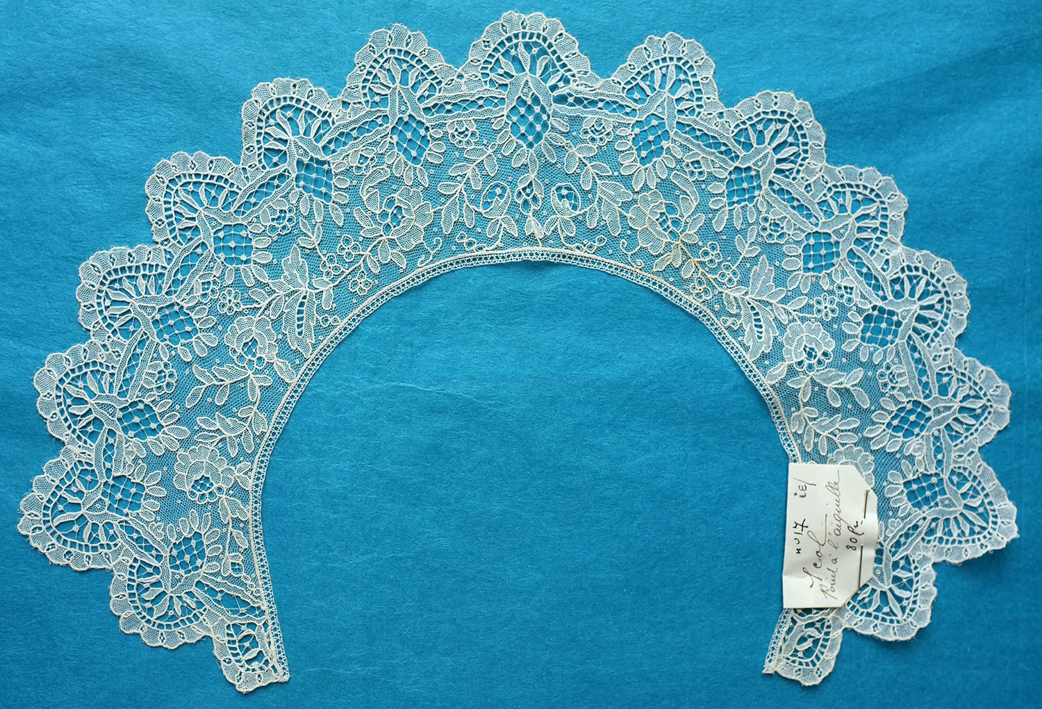 Comments: A collar of Point de Gaze with long front points. Single and multiple raised petals in the roses. Elaborate decorative ‘mode’ fillings, including some large medallions. A well-designed high-end market piece.