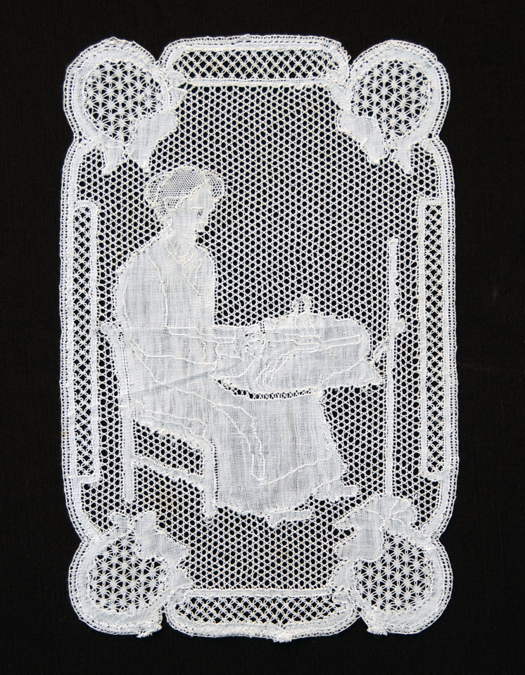 Comments: Probably a souvenir Bloemwerk piece, showing a Belgian maker at her kantkussen with bobbins in raised work. There’s a view of something in Bruges out one window, and a spider with web in another window. All this is quite well done, and note the complex plaited grounds. Unfortunately the dimensions are not given. Things like this do come up occasionally, but not often. I have a Point de Paris lacemaker in my own collection (shown below).