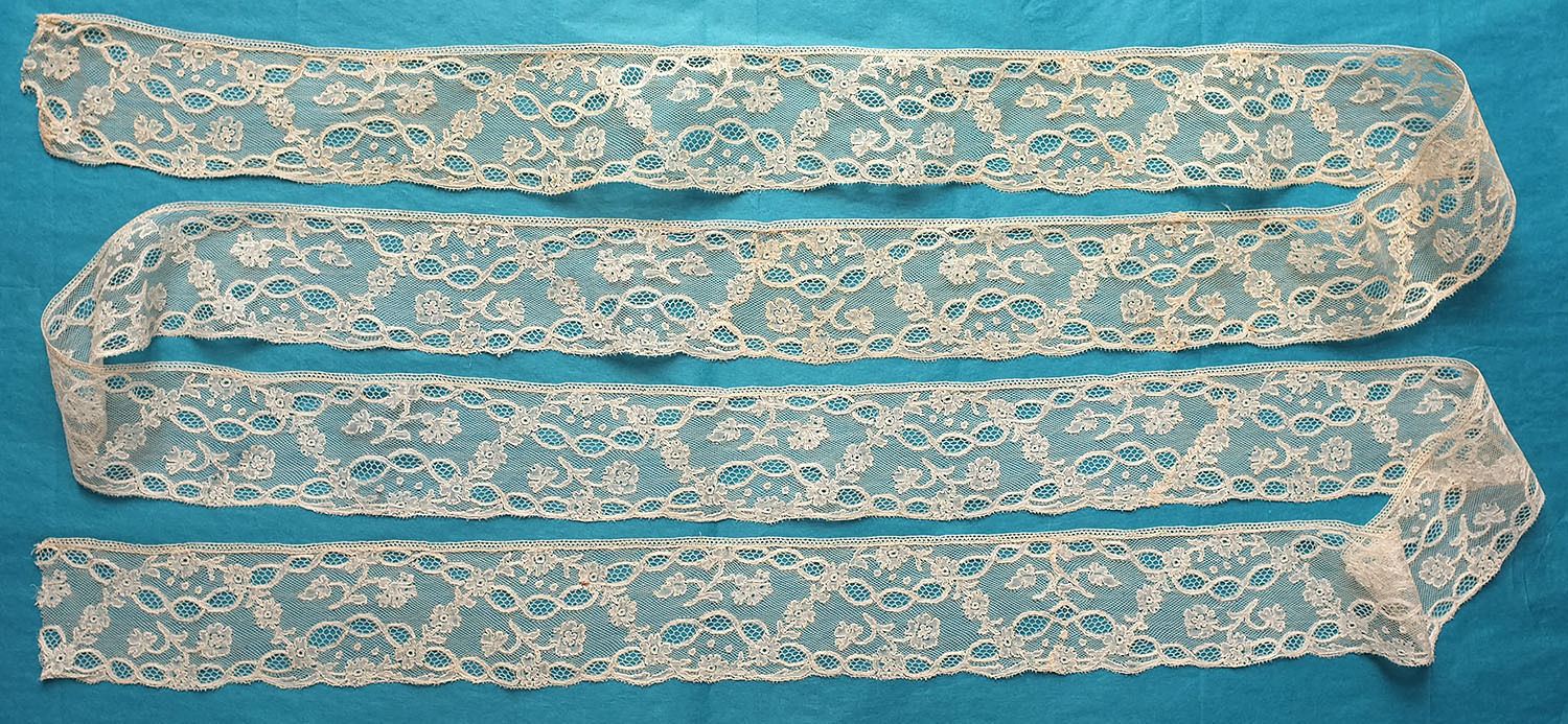 Comments: A short length of Point de Gaze. No raised work. Some lines of rings used as fillings, and one large ‘mode’ flower per repeat. Good wide border.