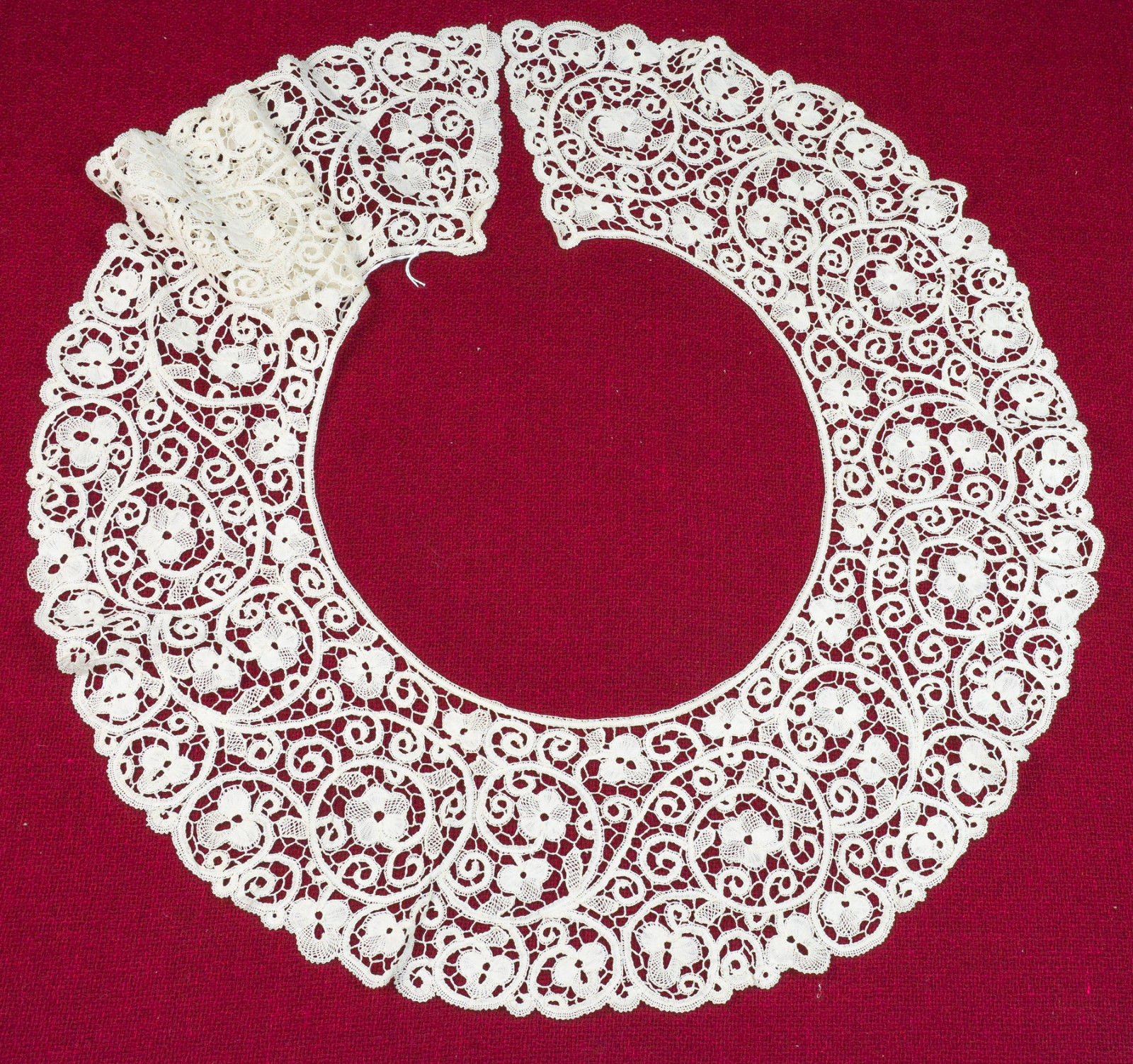 Comments: A collar of Duchesse de Bruges, very much on the Bloemwerk side. Bold design with conventional motifs against a square picoted bride ground. There is a little raised work on halfstitch background in the strapwork. Large woven square tallies used as fillings.