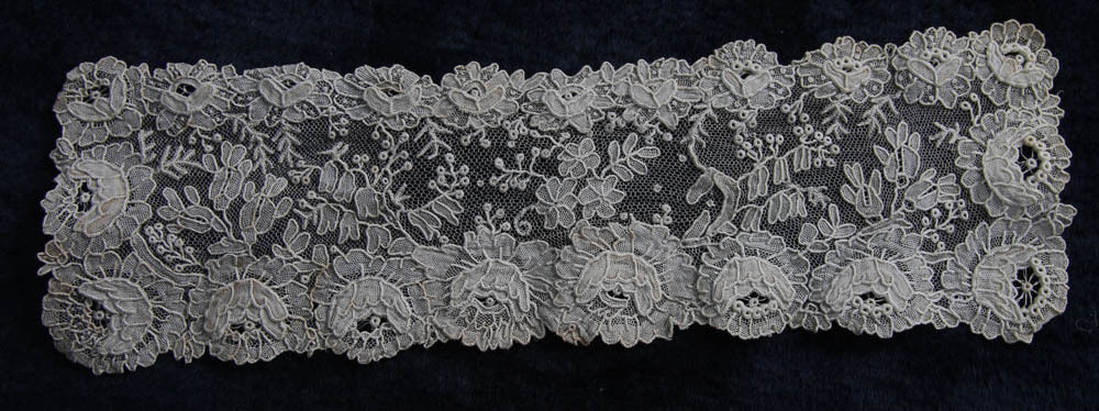 Comments: A single cuff of Point de Gaze. Unusual pattern of roses entirely around all the edges, closely set together. Raised petals, minimal decorative ‘mode fillings. The center is more open with small leaves and vines.