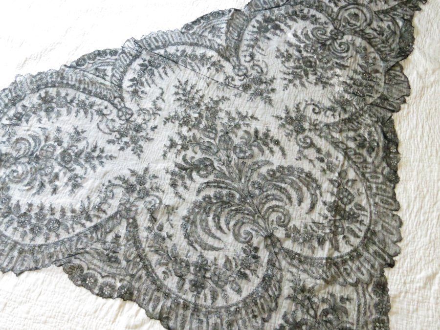 Comments: A triangular Chantilly shawl. No esprits in the ground. The main design is a tower of flowers and leaves, the design of which is repeated in the corners of the side points.