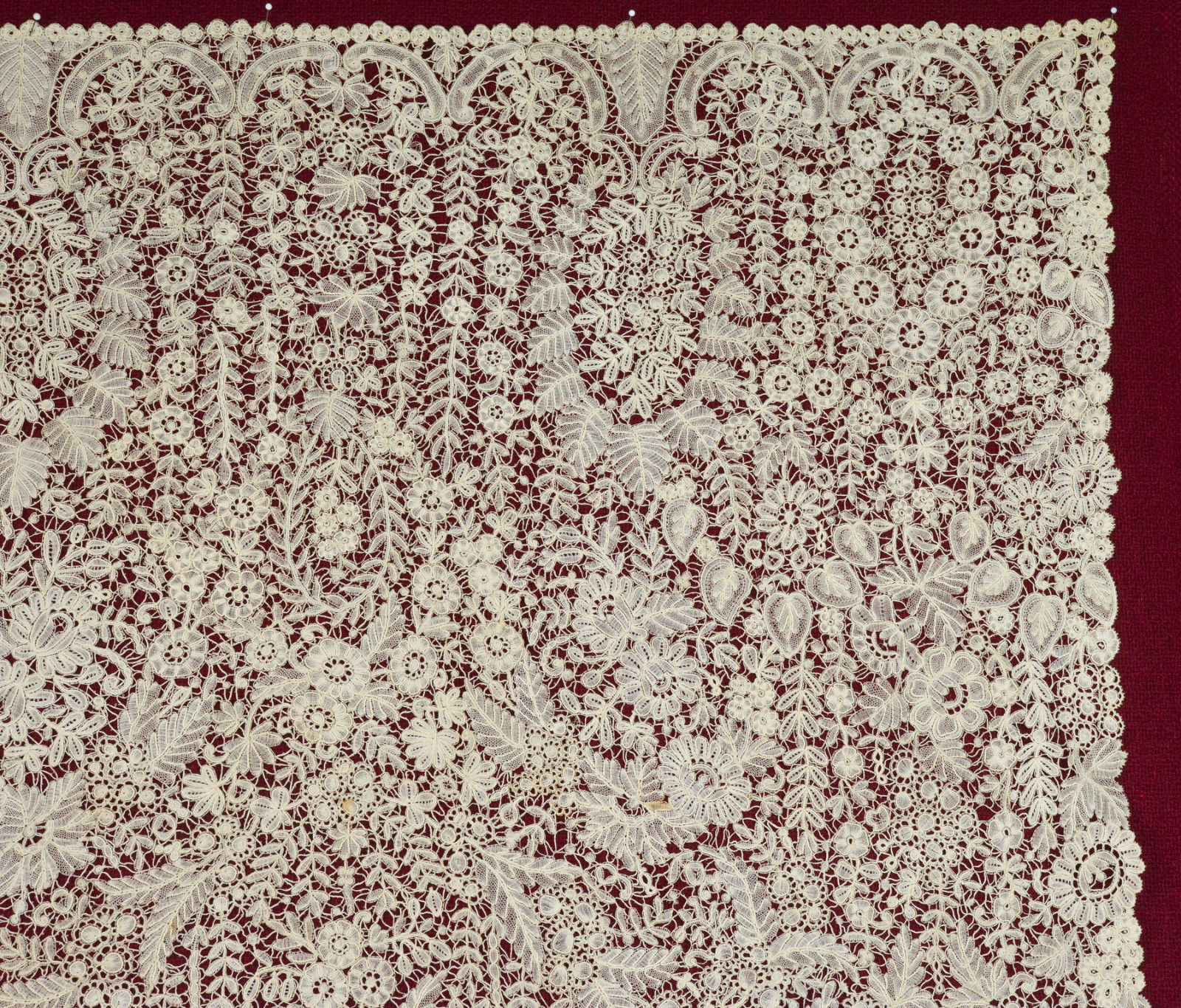 Comments: A Brussels Duchesse skirt panel. Quite an elaborate Second Empire design, very dense. There’s a little raised work on halfstitch ground in the strapwork at the bottom. Just above this there’s a line of decorative ‘mode’ needlelace fillings.