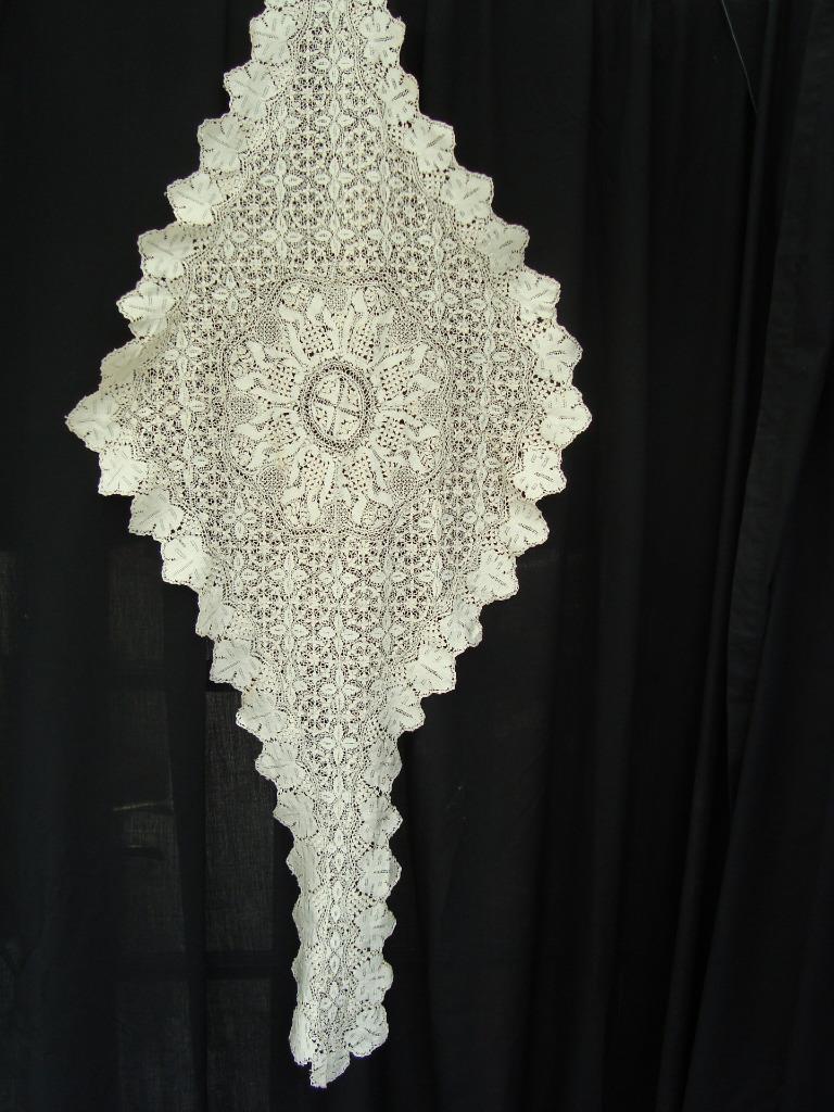 Comments: A mantilla of ‘pale gold’ silk Maltese. Quite an elaborate design – a line of guipure leaves around the outer border. Inside is a ‘patchwork’ leaves and circles. Next comes more guipure, then a central Maltese cross. Excellent, tight work.