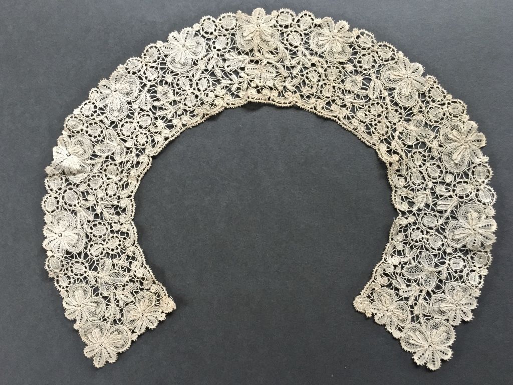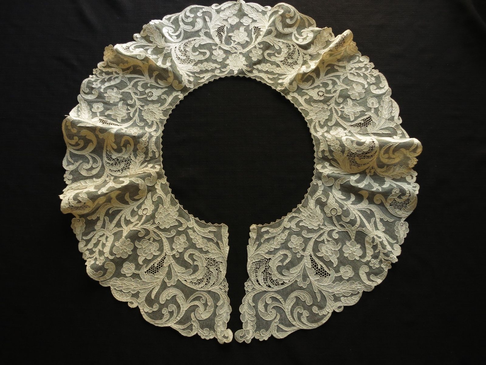 Comments: A scalloped Brussels Duchesse collar or dress front with raised petal roses in the three Point de Gaze inserts. Raised work against halfstich background in the bobbinlace. Dense design of conventional motifs.