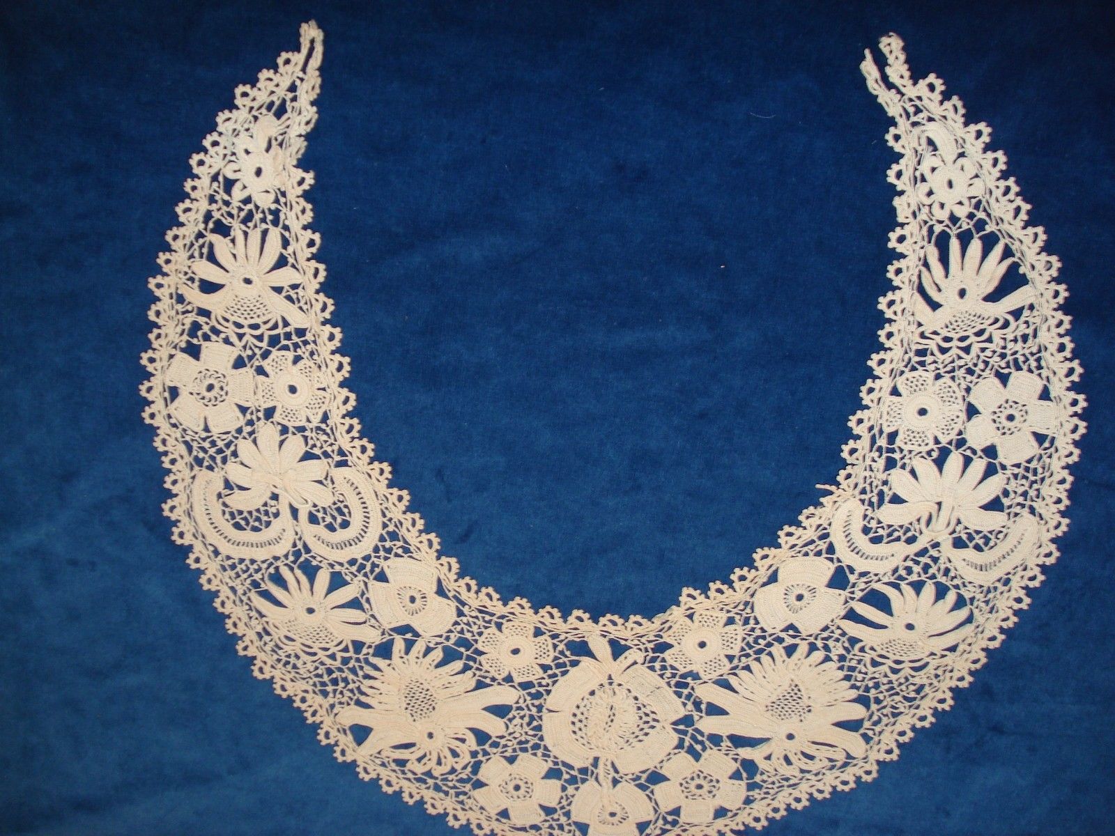 Comments: An Irish Crochet collar with a lighter Rose of Sharon pattern inside, and heavier guipure motifs on the outside. This can be a very effective combination. Good raised work in the motifs, and note the pinwheels of 3 shamrocks between the roses along the border.