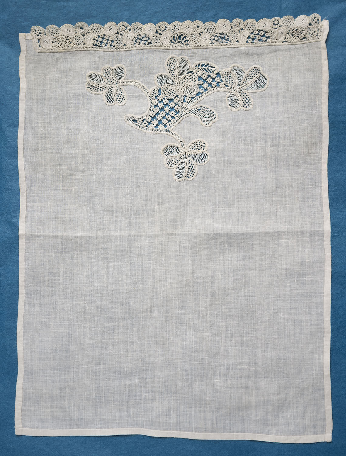Comments: A rectangle of hemmed linen with Youghal needlelace at the top edge and in a carefully cut out insert. The shamrocks in the insert have divided leaves, a nice touch. So is the complex grid filling. Even the best Youghal handkerchiefs rarely have this complexity. The top insert is symmetric around the center point, and a rather simple, but dense design. I don’t know what this is for. Perhaps as suggested by the seller, some kind of dress insert. It’s too small for a hand towel. Note the top border is offset relative to the edges a bid, unsure why. Any suggestions?