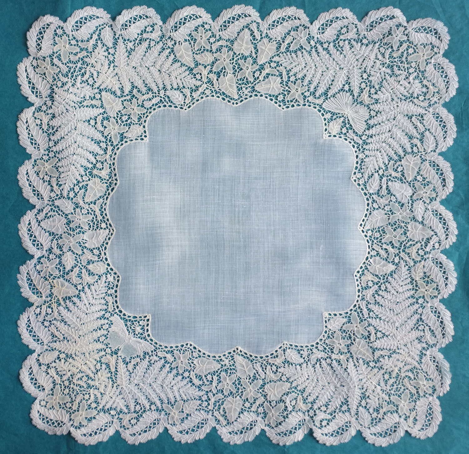 Comments: A Brussels Duchesse collar with lappet ends, and with a separate ruffle attached at the back of the neck. Raised petal Point de GAze roses with no ground are set into the bobbinlace, which is almost all finely woven fern leaves. A few round and scroll elements, but these are minor.