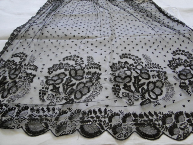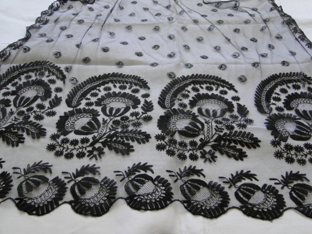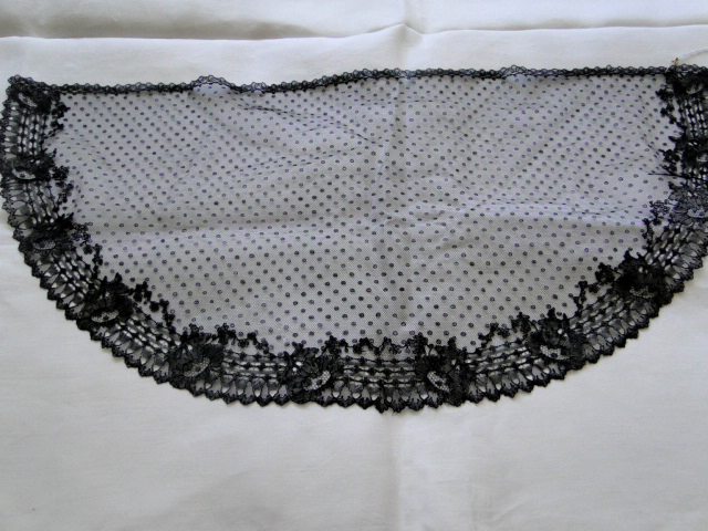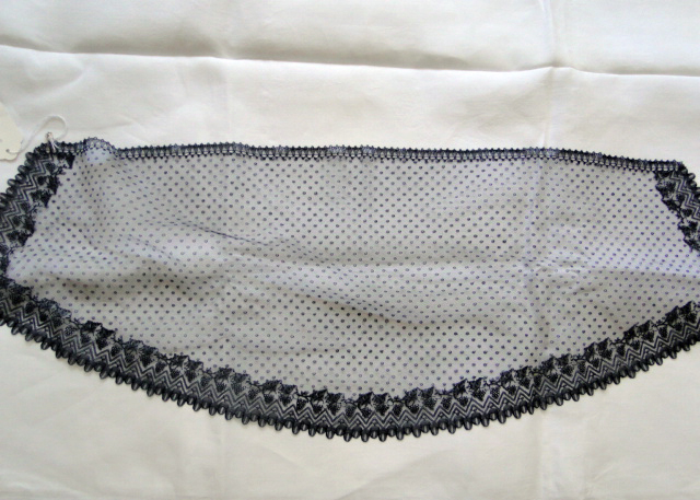 Comments: This is a puzzling piece. Most of the net looks like machine tulle, while the lace along the lower border looks like a point ground bobbinlace. Maybe something like they did in Bayeau with cotton thread. The edges almost look like they are appliqued on. Photos aren’t really close enough to get a good look at the technique. Condition is good, just one area with a few small holes lower right corner.