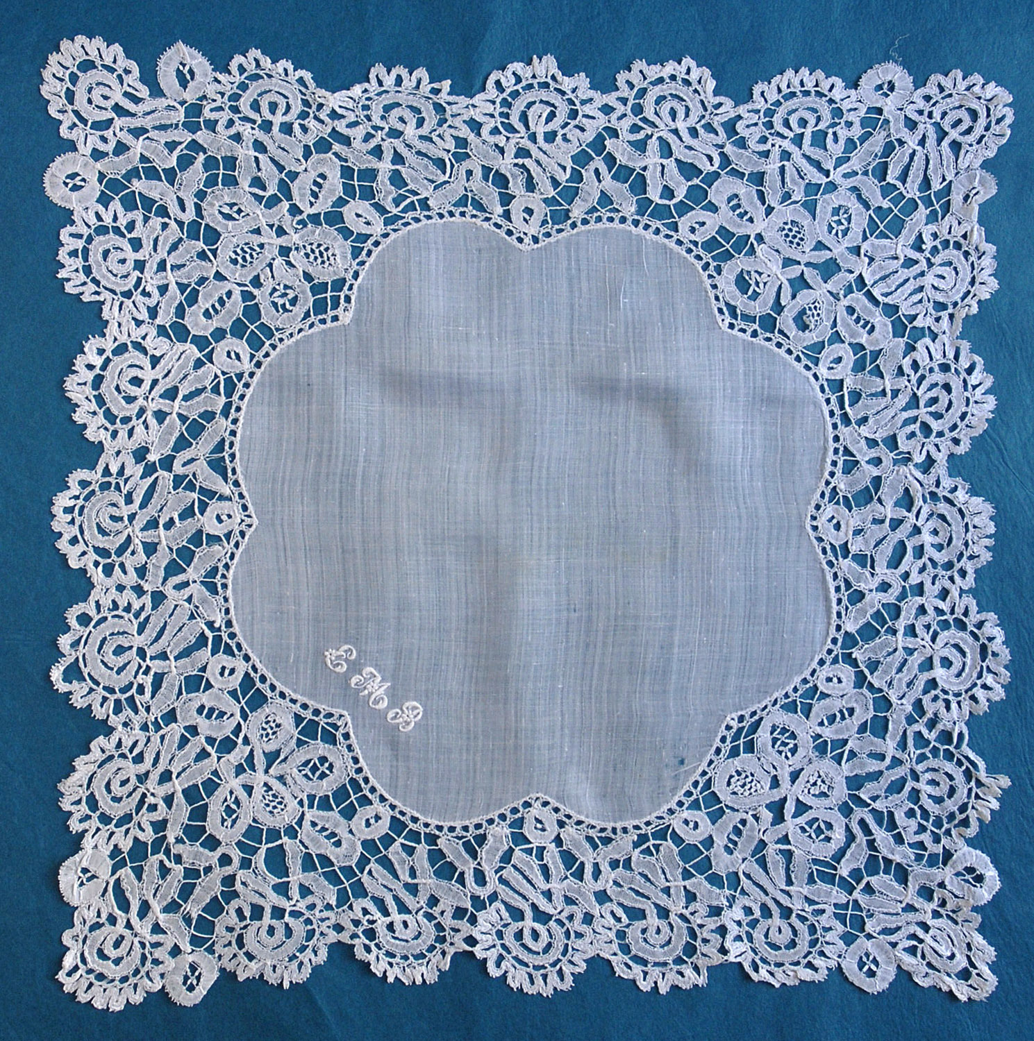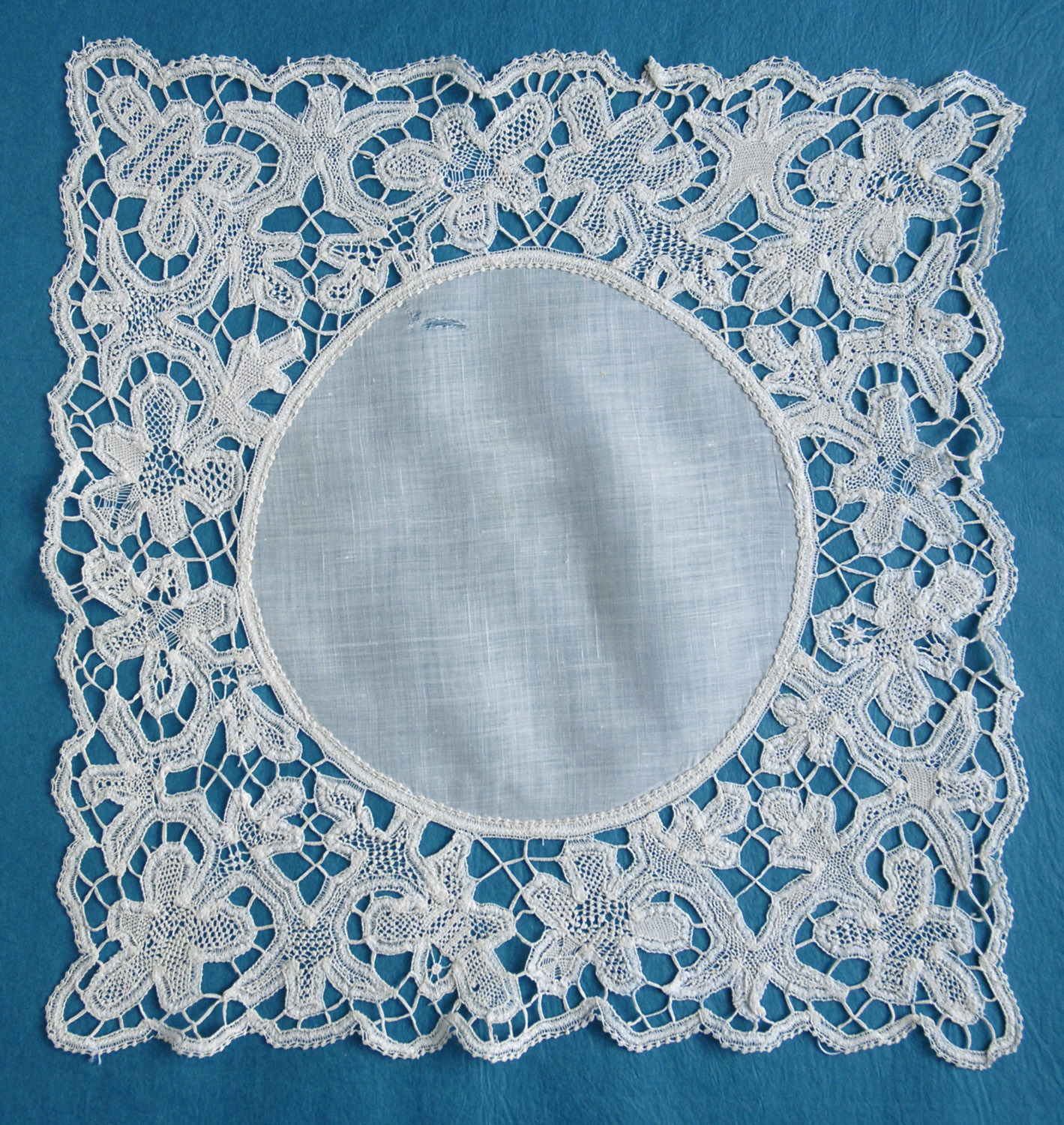 Comments: A handkerchief of Brussels bobbinlace application on machine net. Nice overall design, small, well-made motifs. Looks like it could use a little blocking, and there are some reattachments needed around the center cloth. Overall good condition.