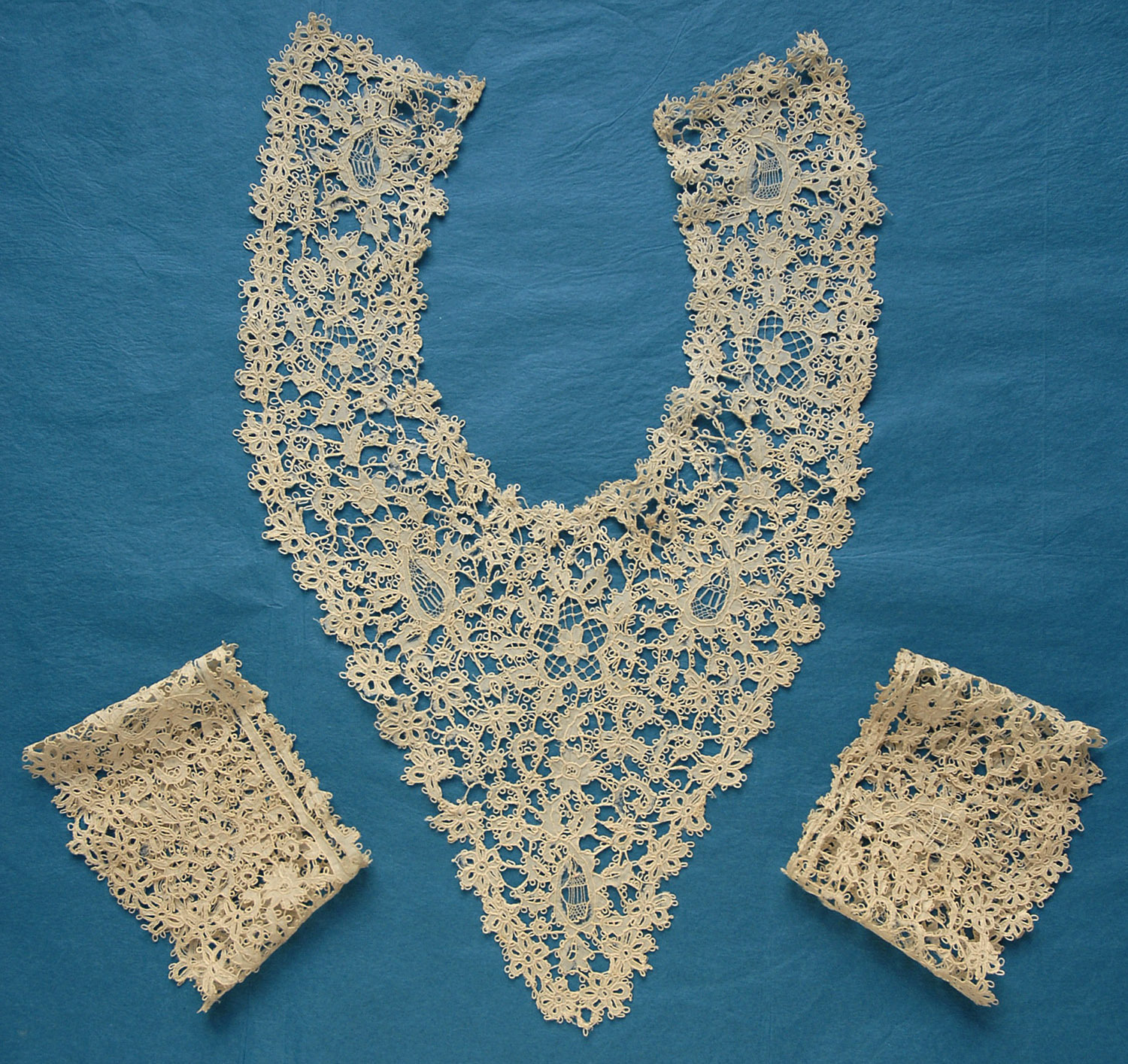 Comments: Three pieces of early 19th c Mechlin, two matching and one different pattern. They all have the straight edge and indented foliate design that can also be found in Beveran laces, but no tallies used as esprits in the ground. A few small holes, mainly at the top edges, and some well-done repairs. Overall good condition.